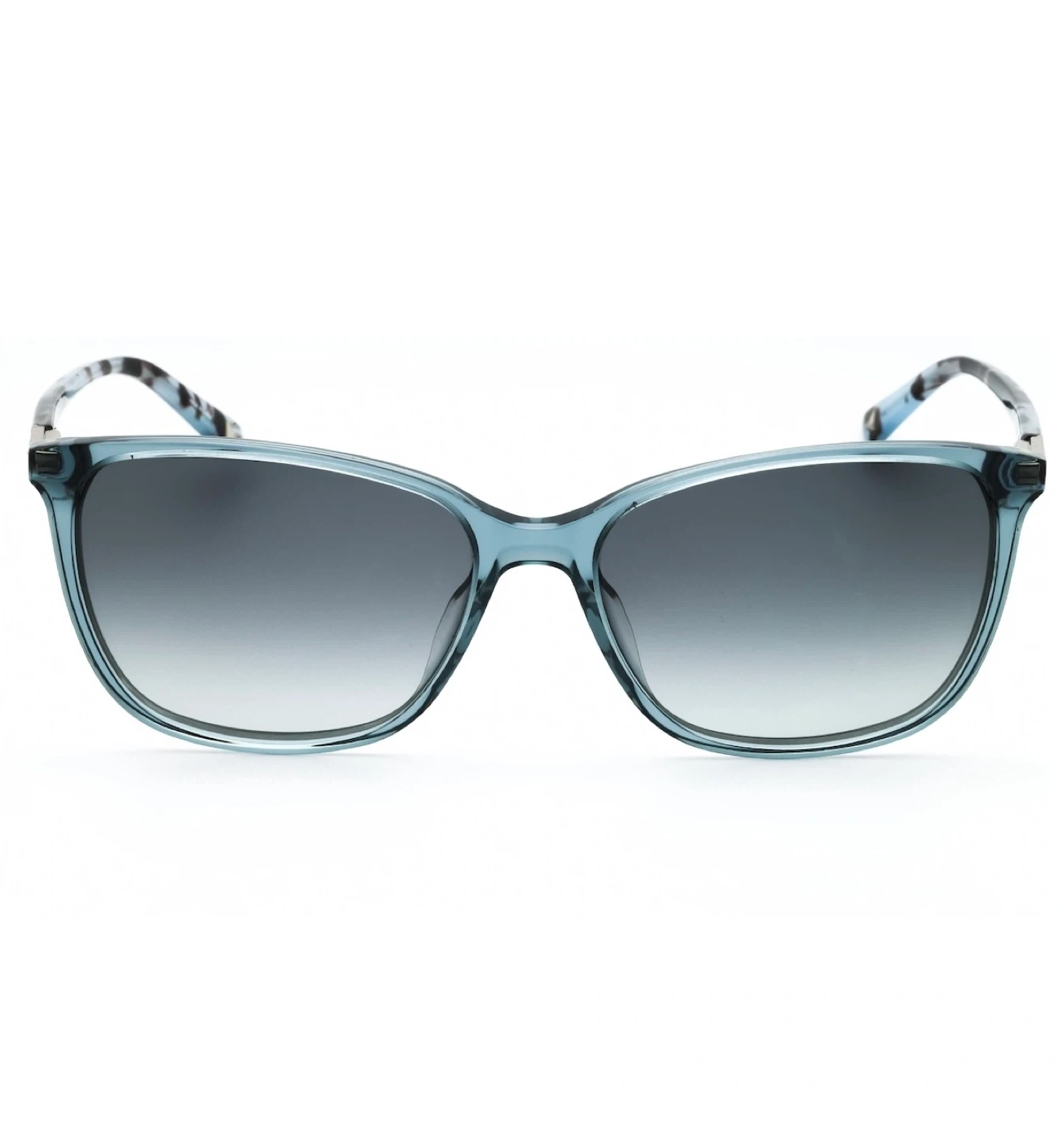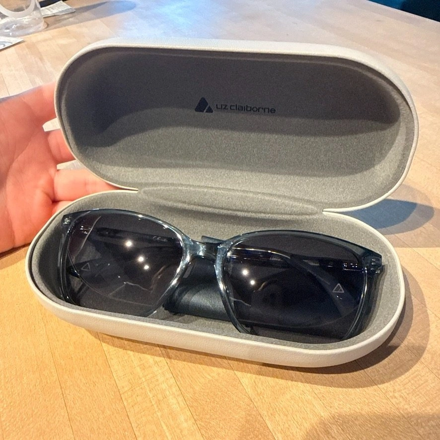 Brand new Liz Claiborne LC827S sunglasses, never worn. Transparent Turq Crystal (turquoise blue) frame with tortoise-pattern arms and dark grey gradient lenses. Oversized cat-eye / butterfly shape. Includes the original Liz Claiborne hard case and microfiber cleaning cloth.