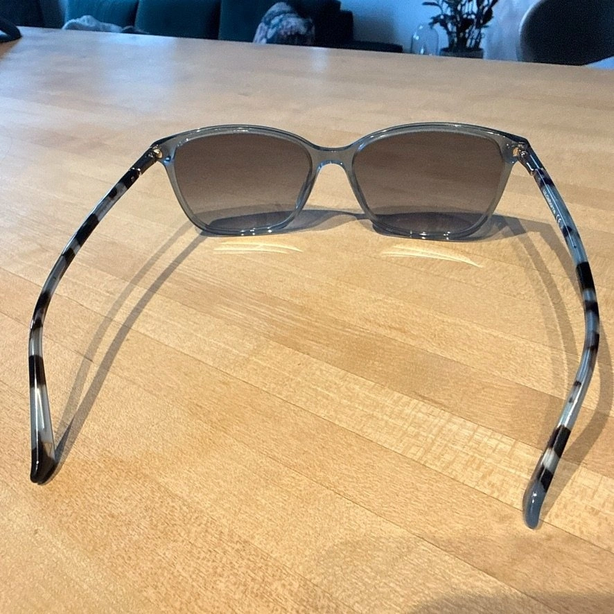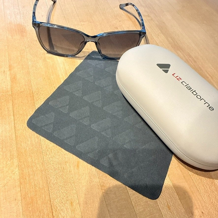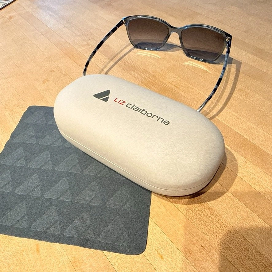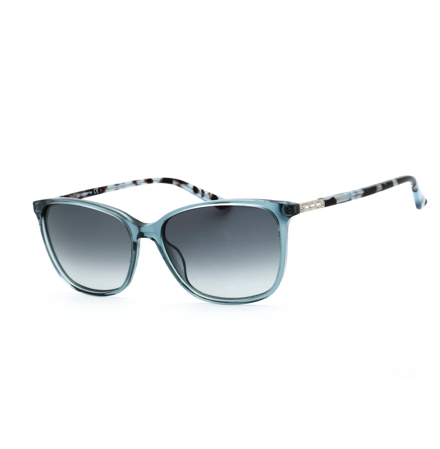 Brand new Liz Claiborne LC827S sunglasses, never worn. Transparent Turq Crystal (turquoise blue) frame with tortoise-pattern arms and dark grey gradient lenses. Oversized cat-eye / butterfly shape. Includes the original Liz Claiborne hard case and microfiber cleaning cloth.