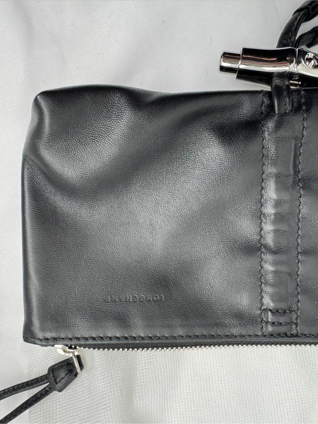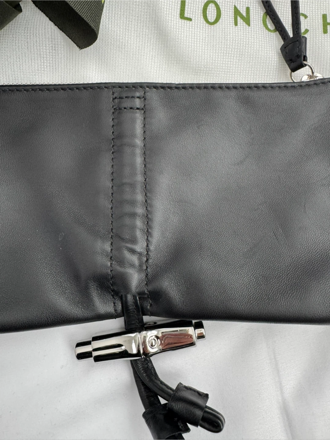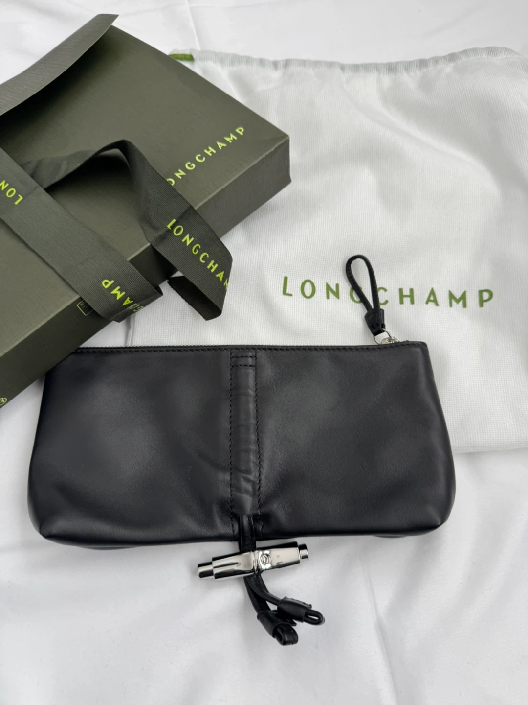 This is a Longchamp pouch in black leather. It features the signature Longchamp toggle closure and a zippered top. Includes original box and dust bag.
