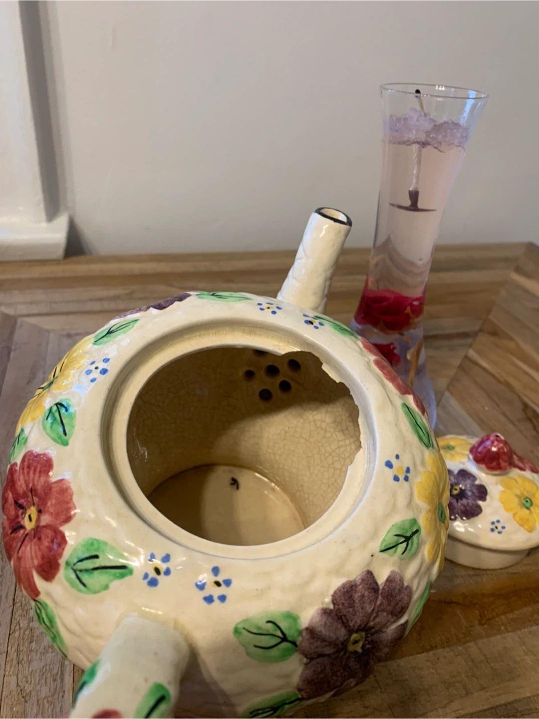 A charming ceramic teapot adorned with a colourful floral design and a glass gel candle.