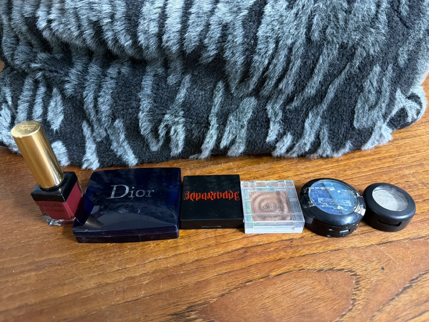Includes YSL Baby Doll Kiss & Blush, Dior powder, MAC eyeshadows, and L'OrΓ©al eyeshadow. A collection of various makeup products.