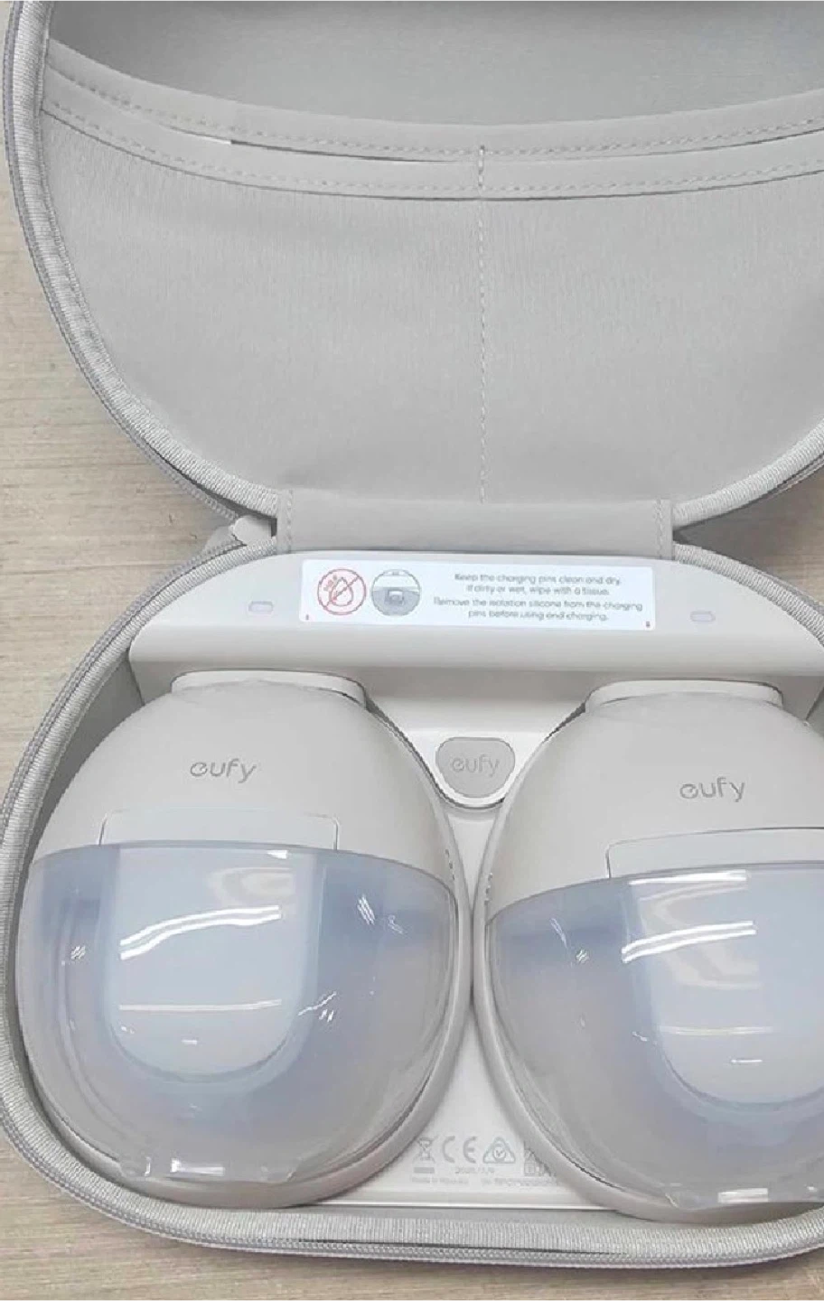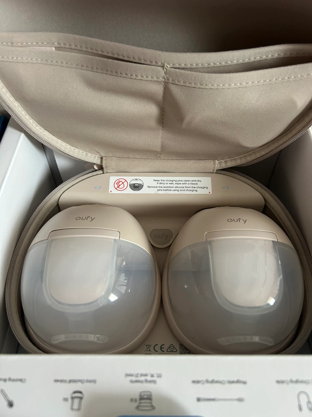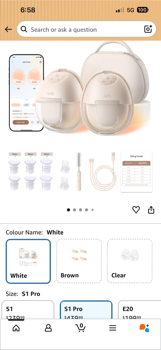 Eufy Smart Double Electric Breast Pump. This double pump comes in white and is the S1 Pro model. It includes a charging case, multiple flange sizes (17mm, 19mm, 21mm), a cleaning brush, and a USB charging cable.