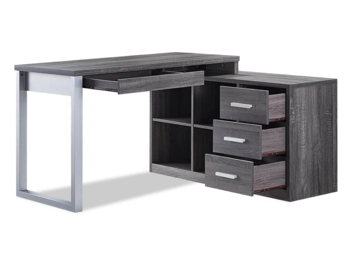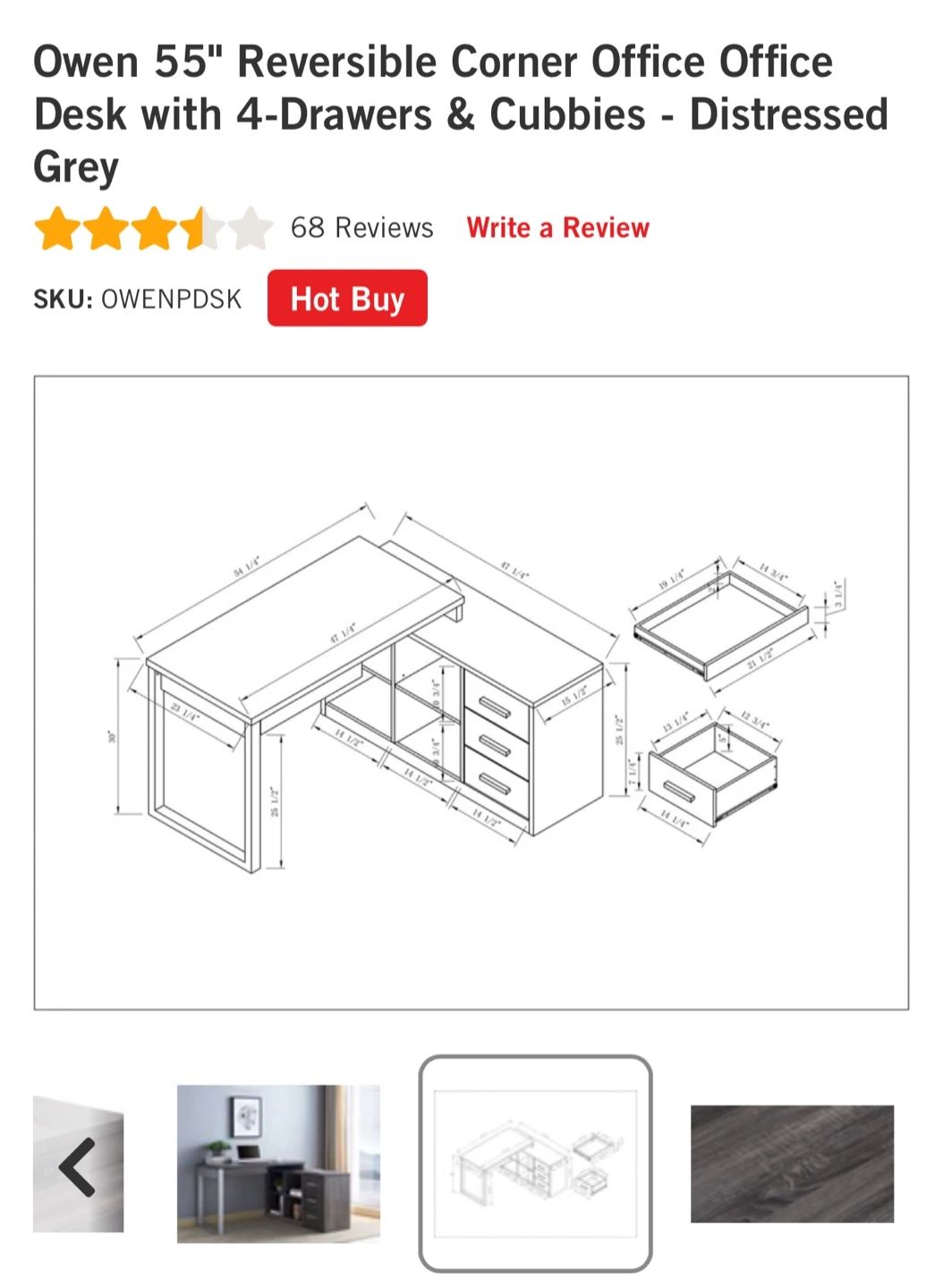 5Looking to sell this Owen 55" Reversible Corner Office Desk with 4-Drawers & Cubbies in a distressed grey finish. It's a great addition to any home office setup! The desk features a reversible design, allowing you to configure it to your liking. It also has 4 drawers and cubbies for ample storage space