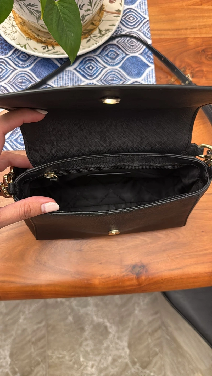 Two stylish black handbags. One Kate Spade satchel, compact and structured. The other, a Michael Kors crossbody bag, features a chain strap. Both bags are in excellent condition. Grab this great deal!