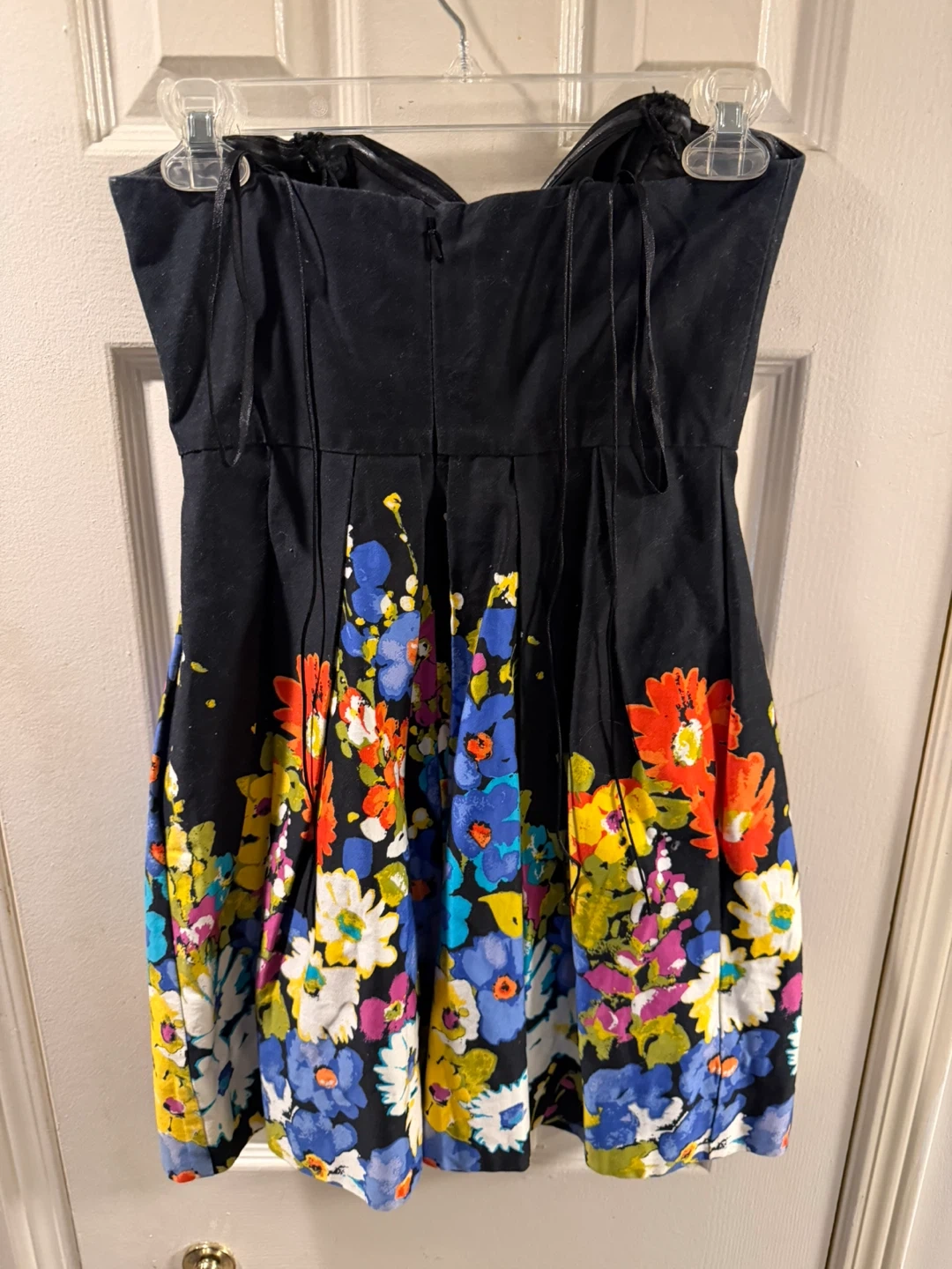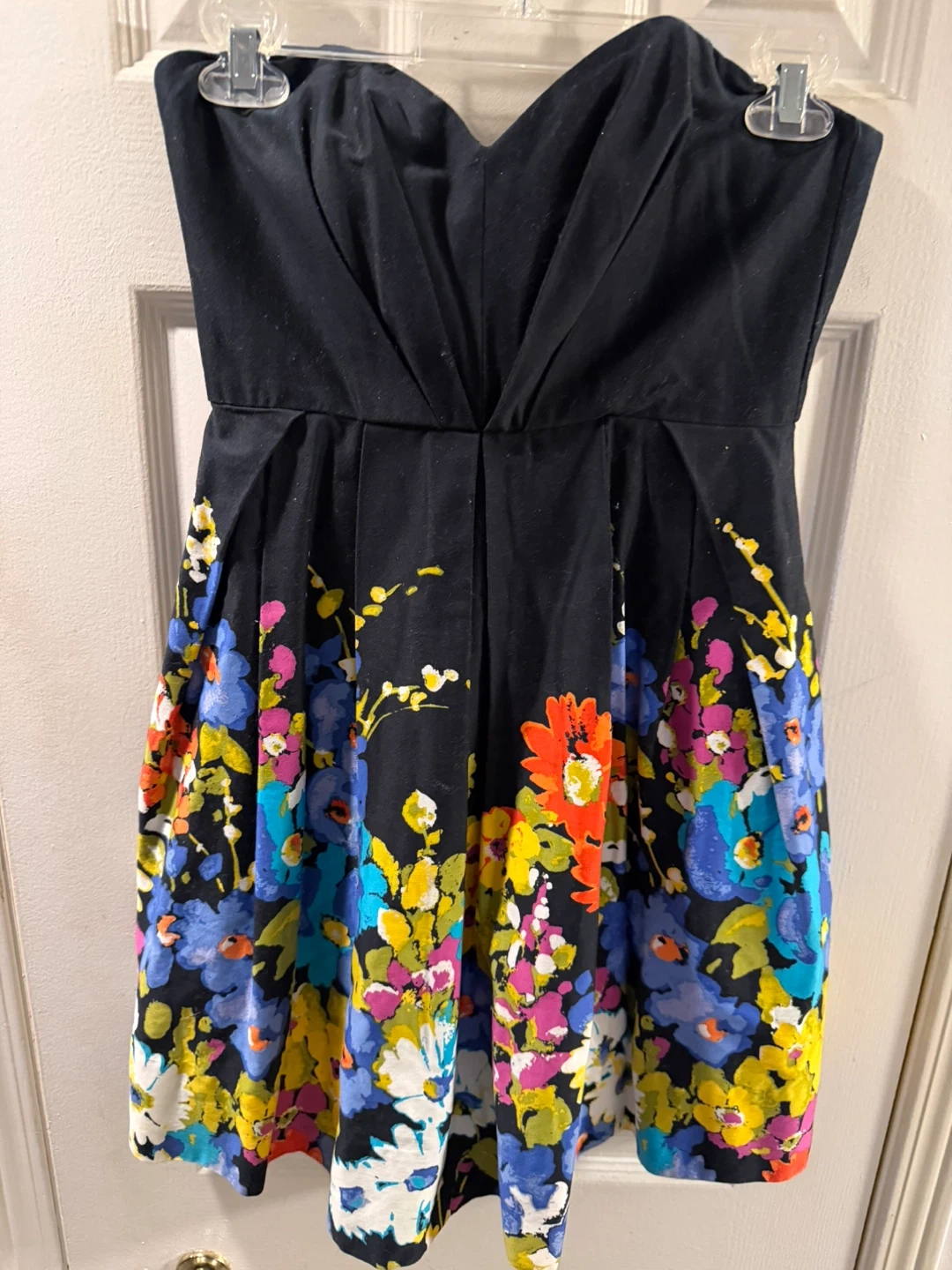 This black strapless dress features a vibrant floral print along the hem. It's a fun, summery piece perfect for warmer days. The bodice has a sweetheart neckline and the skirt is pleated.