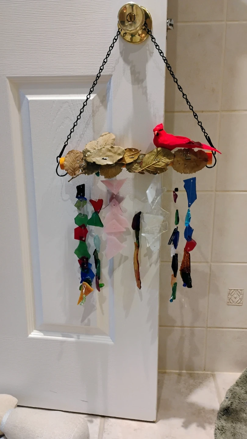 This unique wind chime features colourful glass pieces and natural shells, accented with a decorative bird. It's designed to create gentle sounds with the breeze. It hangs from a metal chain and would add a charming touch to any outdoor space.