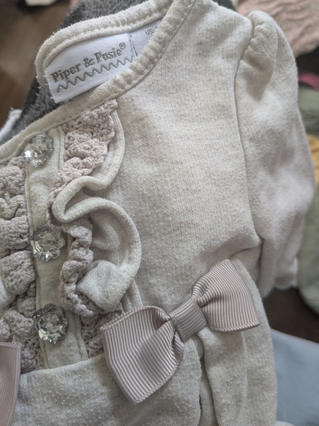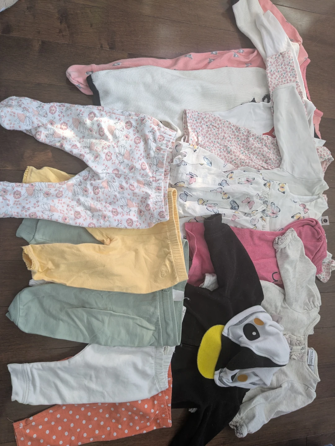 This is a set of baby clothes for sizes US/CA 3-6 months. It includes various tops and bottoms.