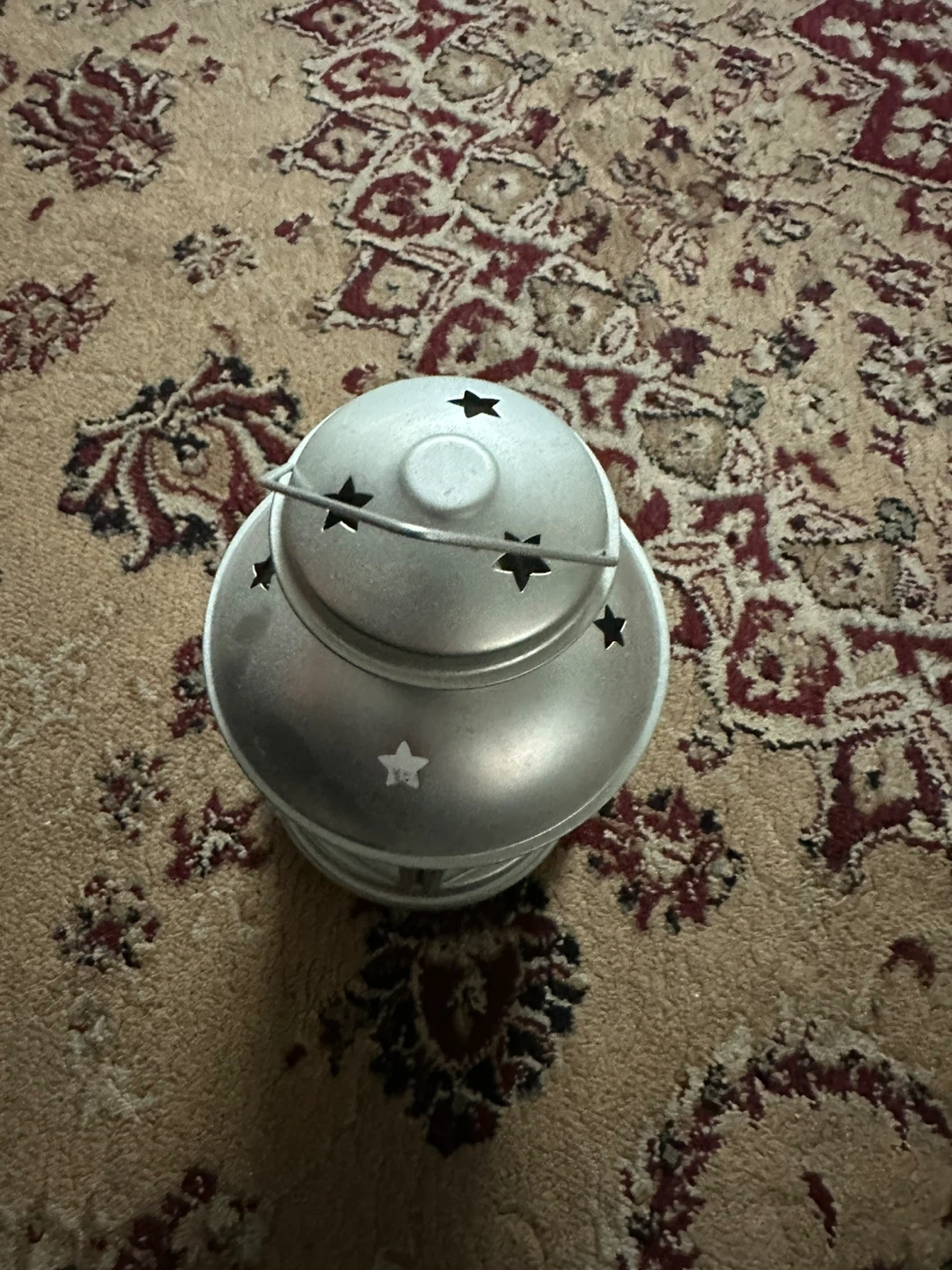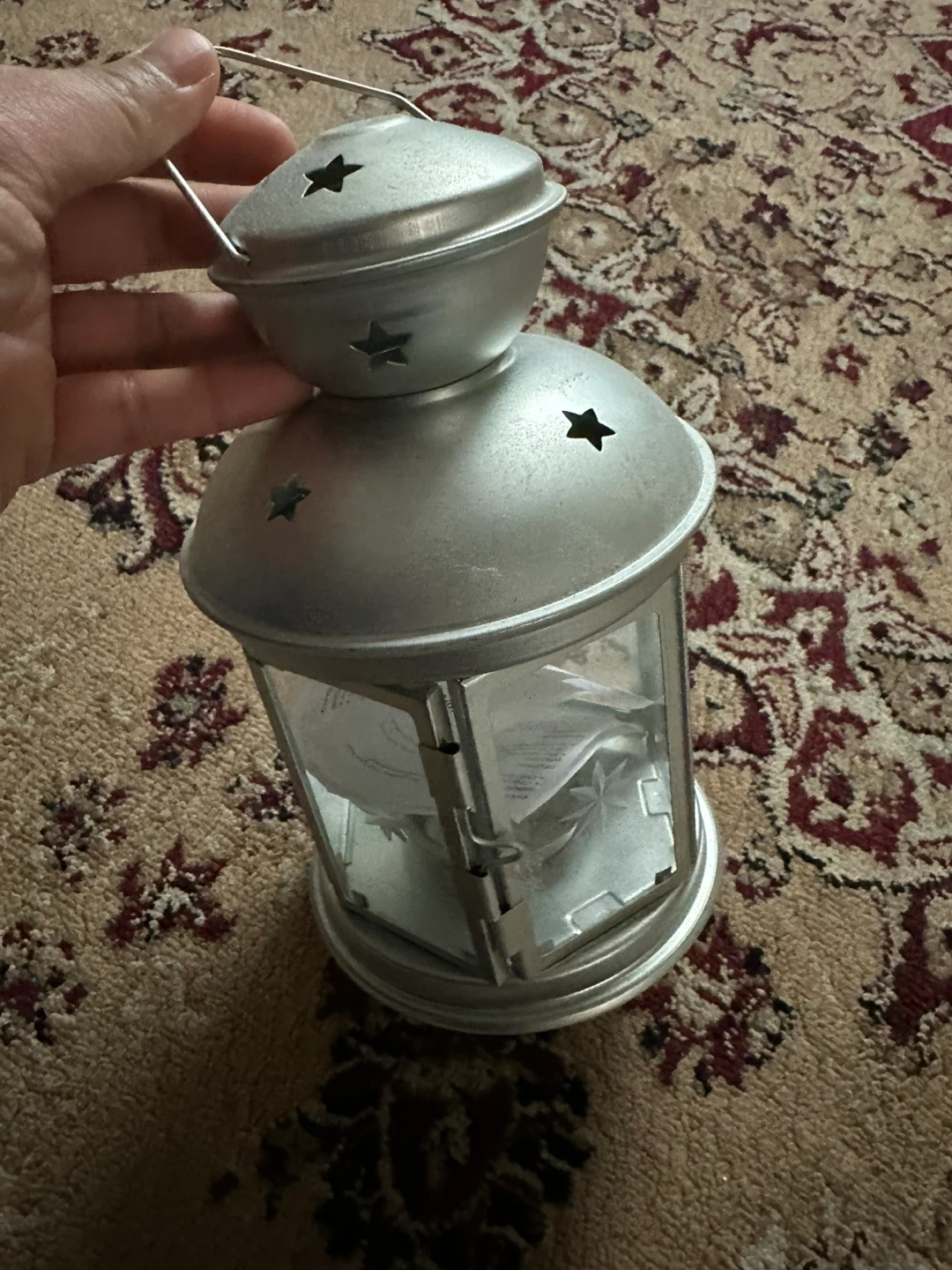 This silver metal lantern features star cutouts on its top and sides. It has glass panels and a hinged door for access. Includes a small candle holder inside. Perfect for creating ambiance indoors or out!