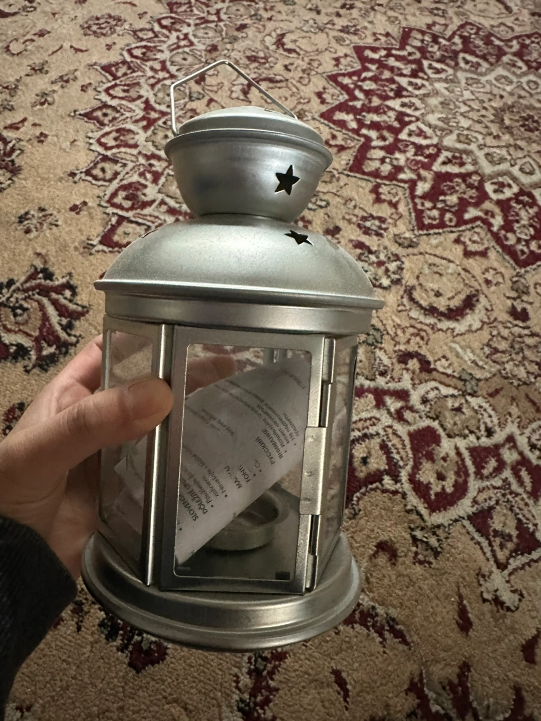 This silver metal lantern features star cutouts on its top and sides. It has glass panels and a hinged door for access. Includes a small candle holder inside. Perfect for creating ambiance indoors or out!