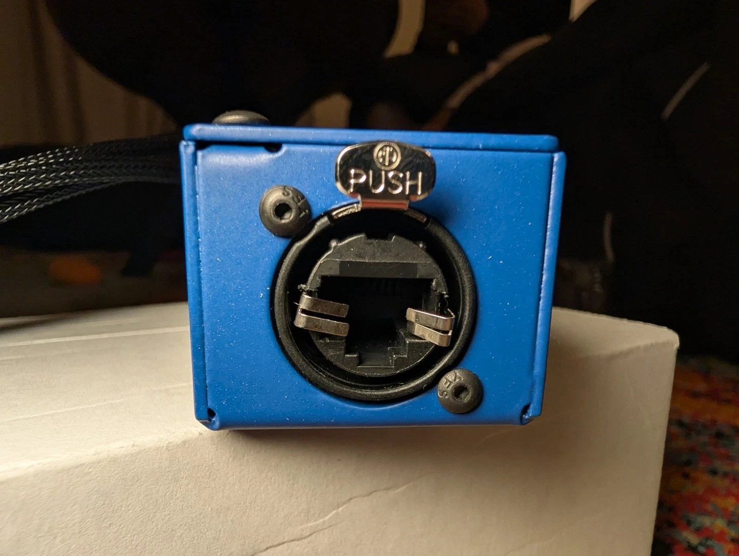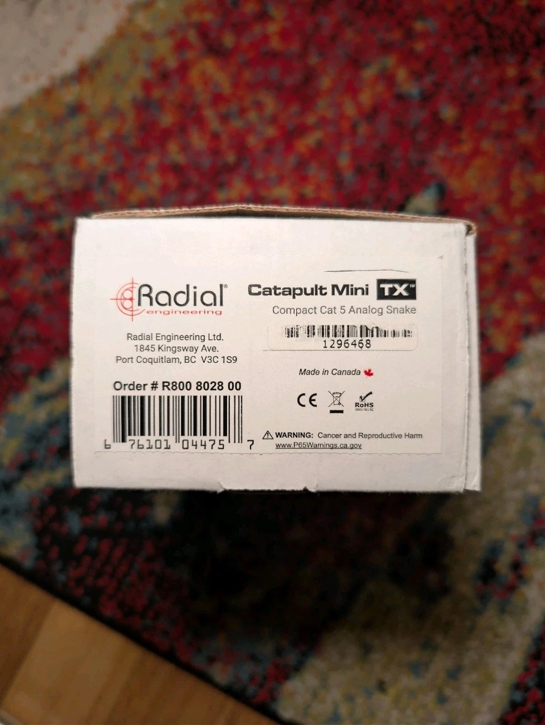 This is an open box Radial Engineering Catapult Mini RX. It's a passive Cat 5 to 4 XLR Male audio snake. Color is blue. Model MPN: R800 8028 00. Features balanced audio.