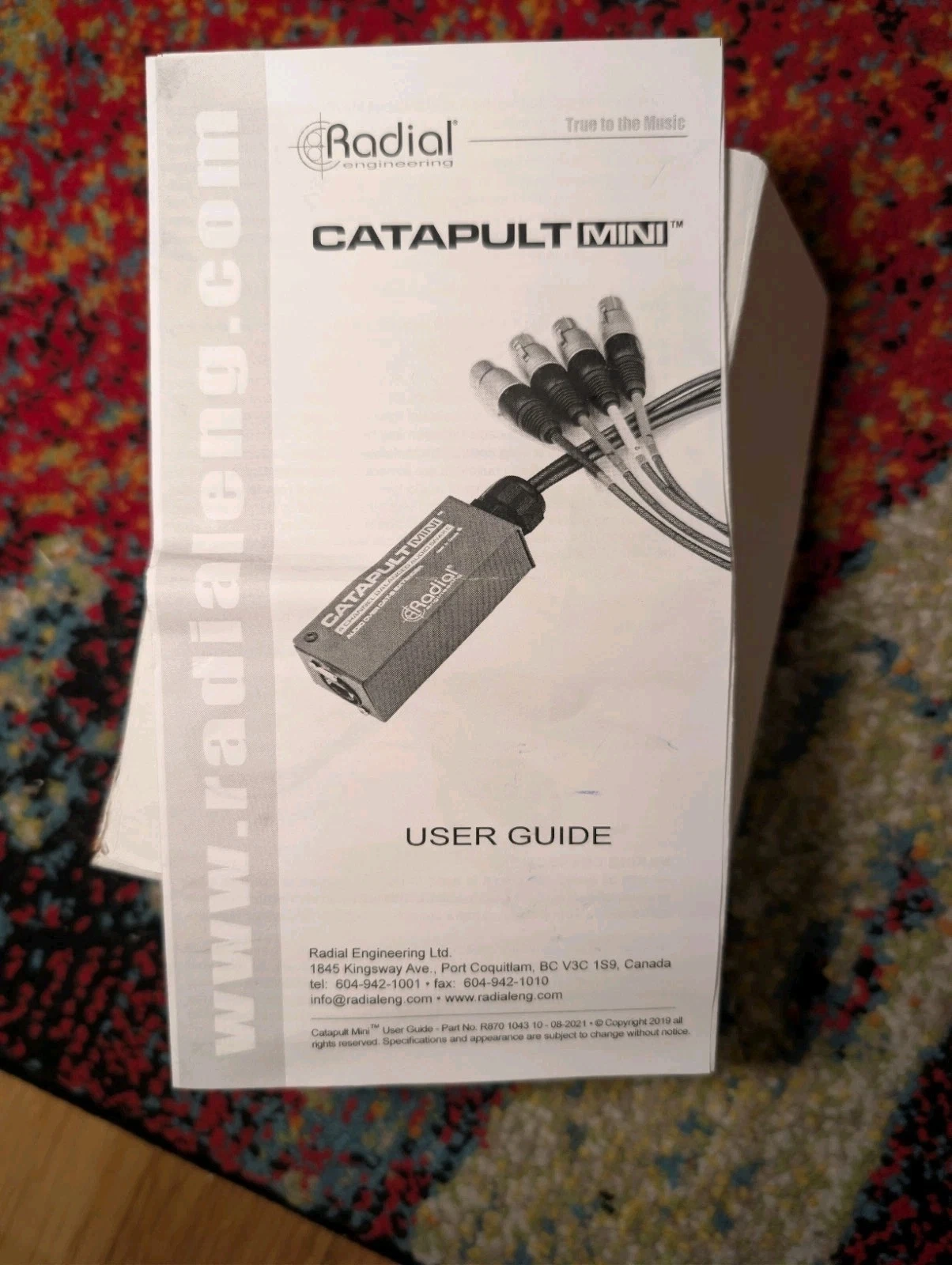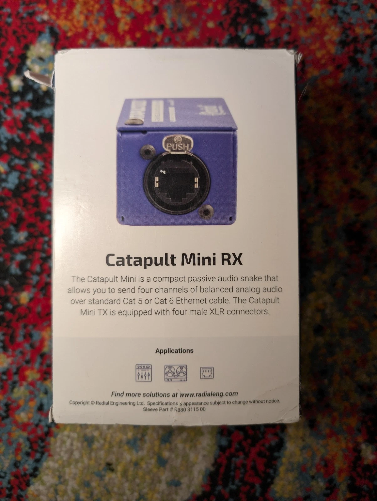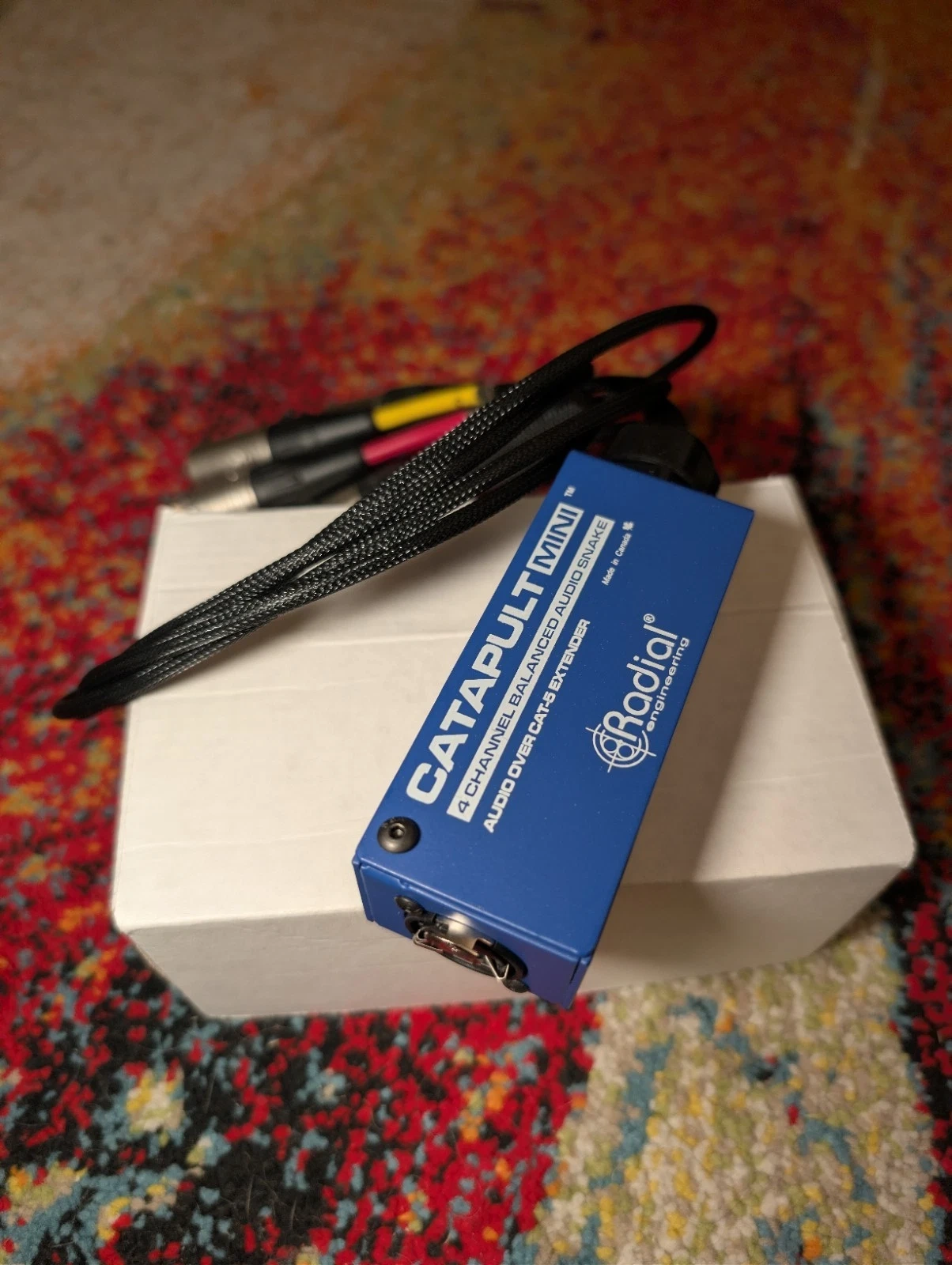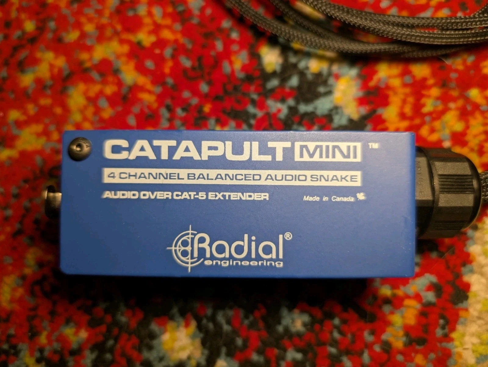 This is an open box Radial Engineering Catapult Mini RX. It's a passive Cat 5 to 4 XLR Male audio snake. Color is blue. Model MPN: R800 8028 00. Features balanced audio.