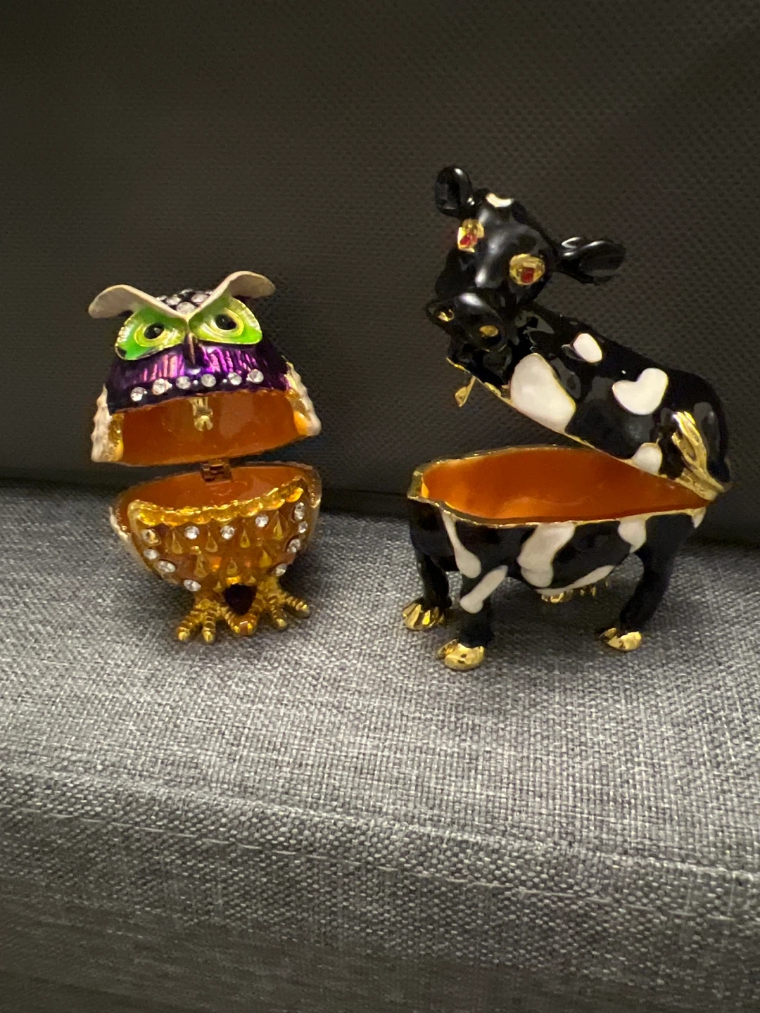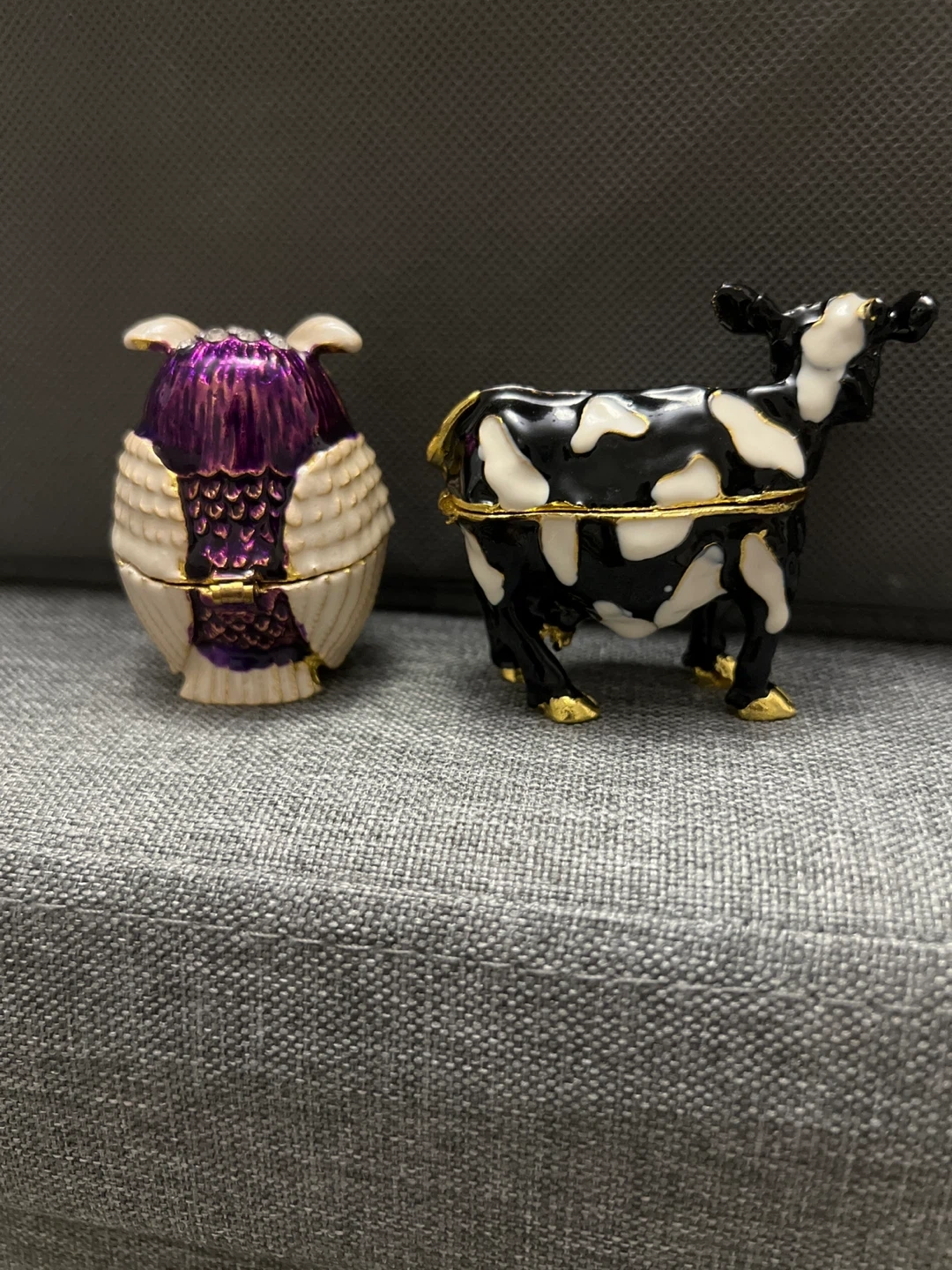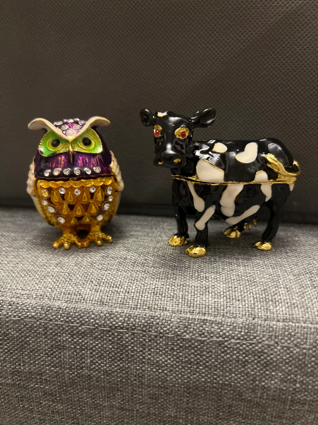 130Two cute brand new trinket boxes for sale! One is an owl with purple and gold accents, and the other is a black and white cow. Both are in great condition and perfect for storing small items