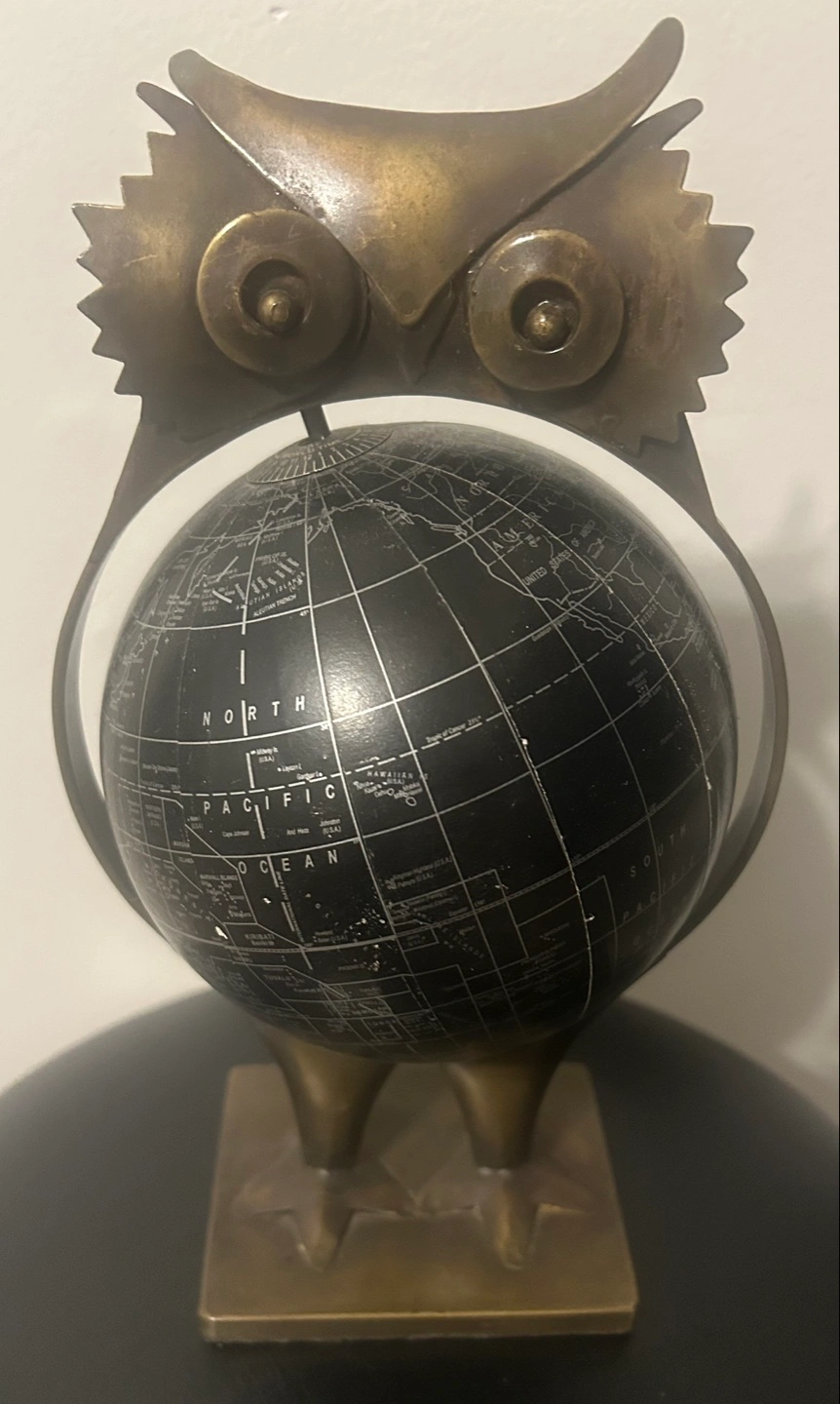 Unique metal owl figurine holding a small globe. Dark metal finish. Decorative accent piece. Perfect for a desk or shelf.