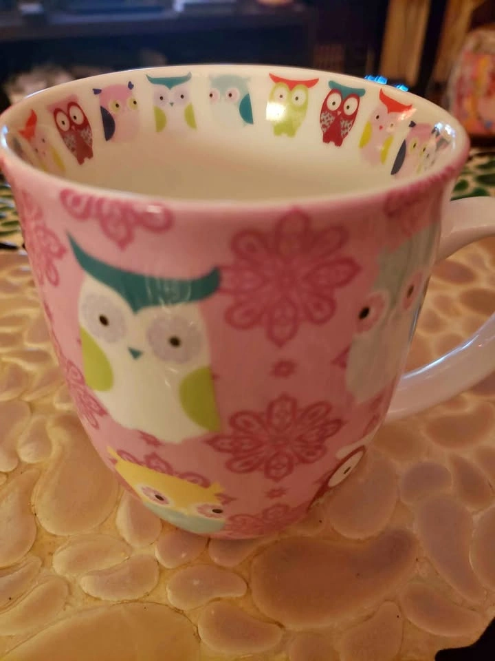25Part of a set of the Owls mugs. Pink snowflake motif with multi coloured owls and a ring of smaller ones inside the rim. Very cute.