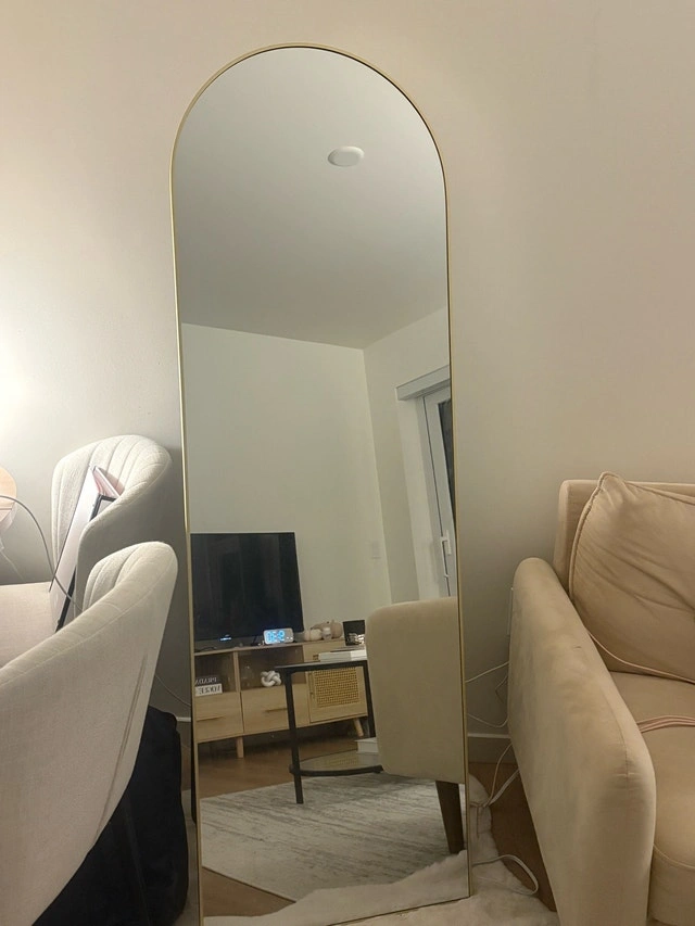 Add a touch of elegance to your living space with this used head-to-toe mirror, featuring a sleek gold frame and a modern arched design. This mirror is perfect for bedrooms, dressing rooms, or entryways. The mirror is in good condition, ready to bring light and style to your home. Additional details include: - Frame Material: Metal - Shape: Arch - Colour: Gold. Cash accepted, Cashless payment.