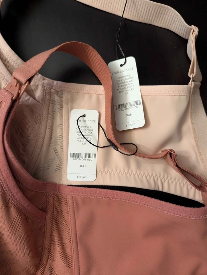 Two nursing bras in nude and rose, size 36H. Both feature flexwire support and strong, easy-to-use snaps. Original price was $72 CAD each. They are brand new, never worn. Selling because sizing did not work out for me. Selling for $10 each, but open to offers.