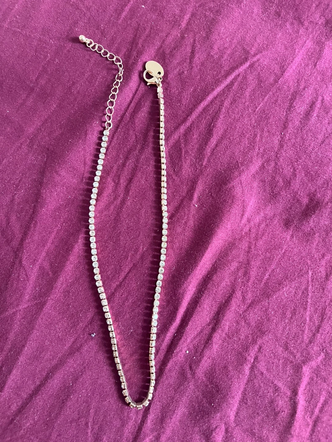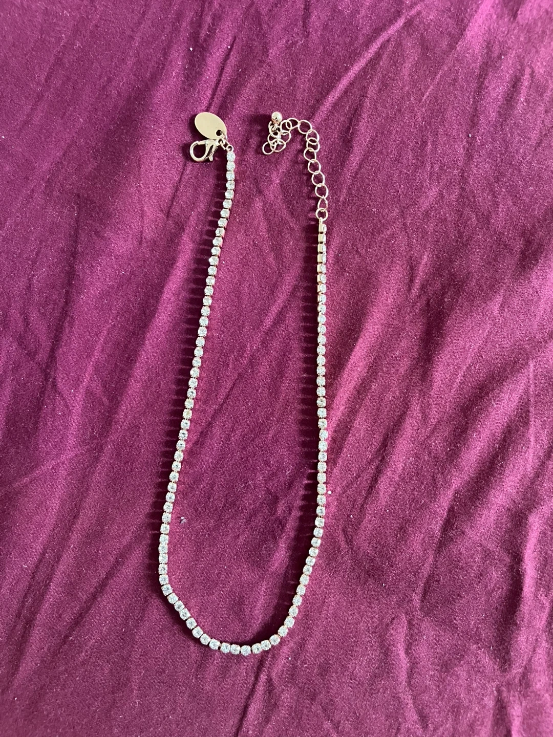 Sparkly tennis necklace with clear rhinestones set in a gold-tone chain. Features an adjustable clasp for a comfortable fit. It's a simple accessory that adds a touch of glamour!