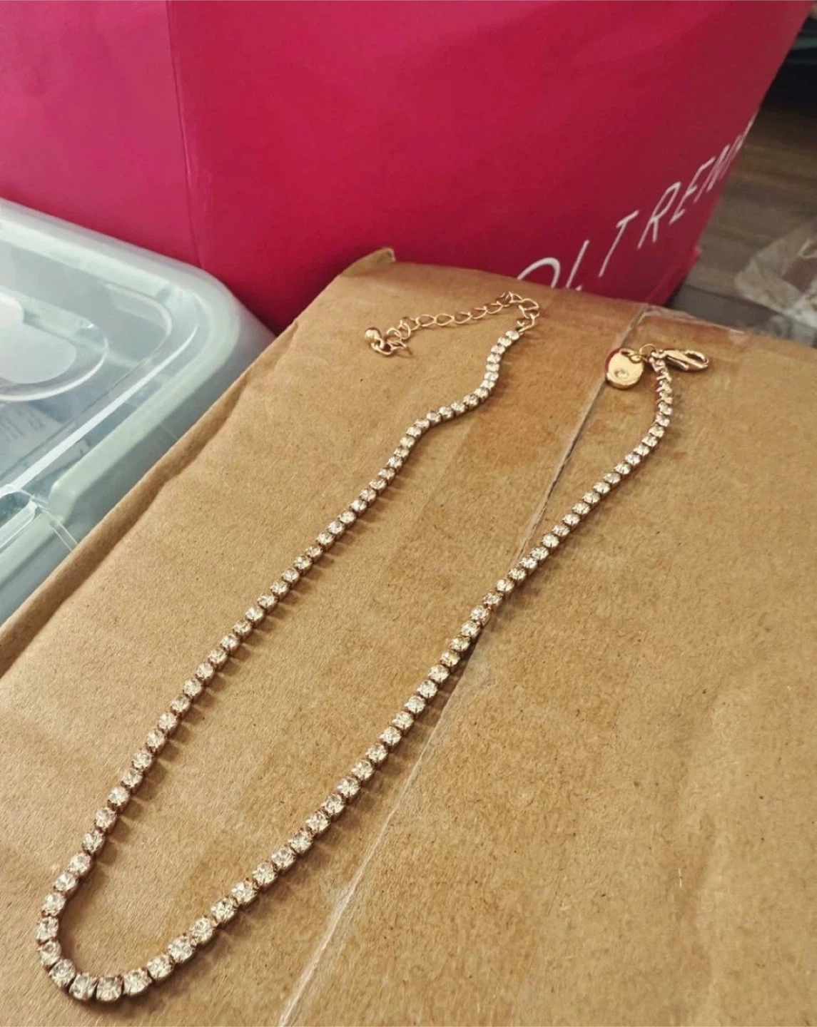 Sparkly tennis necklace with clear rhinestones set in a gold-tone chain. Features an adjustable clasp for a comfortable fit. It's a simple accessory that adds a touch of glamour!