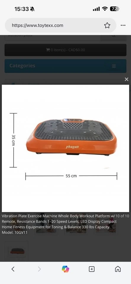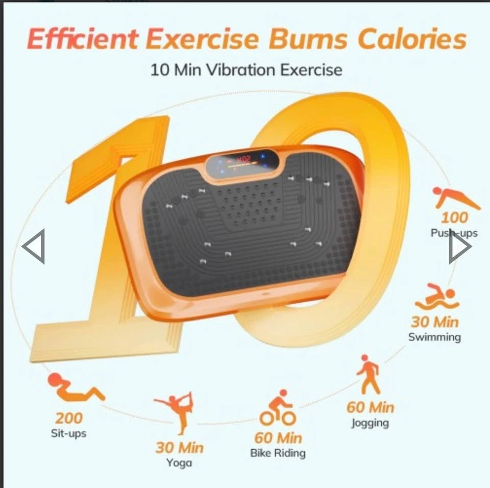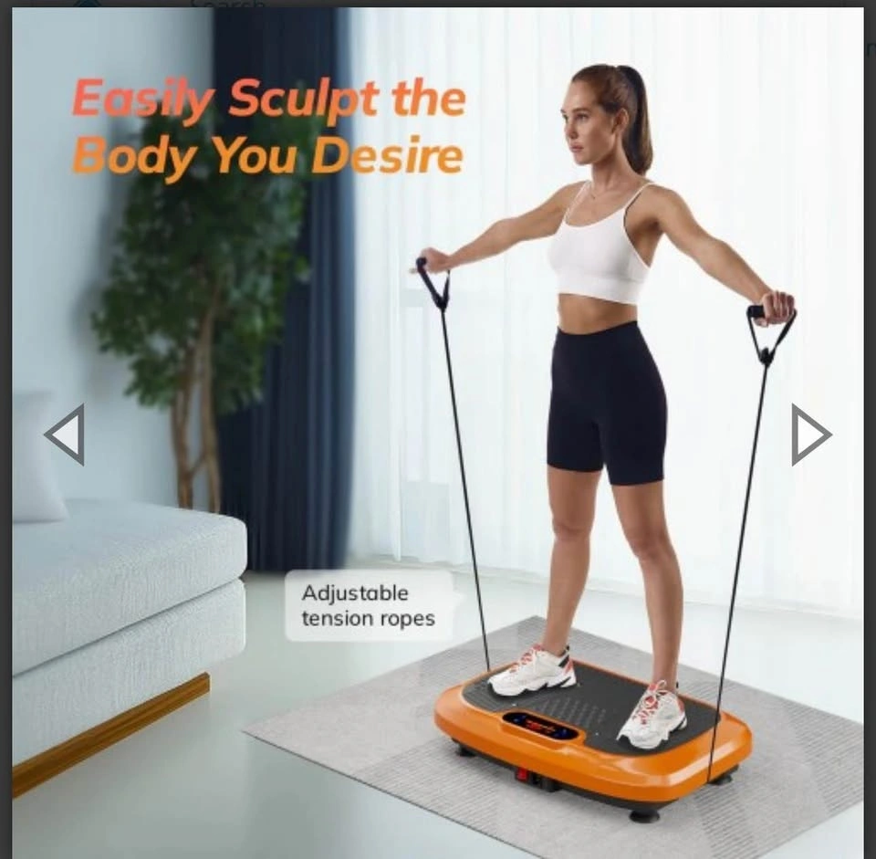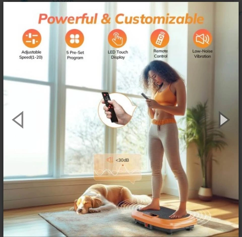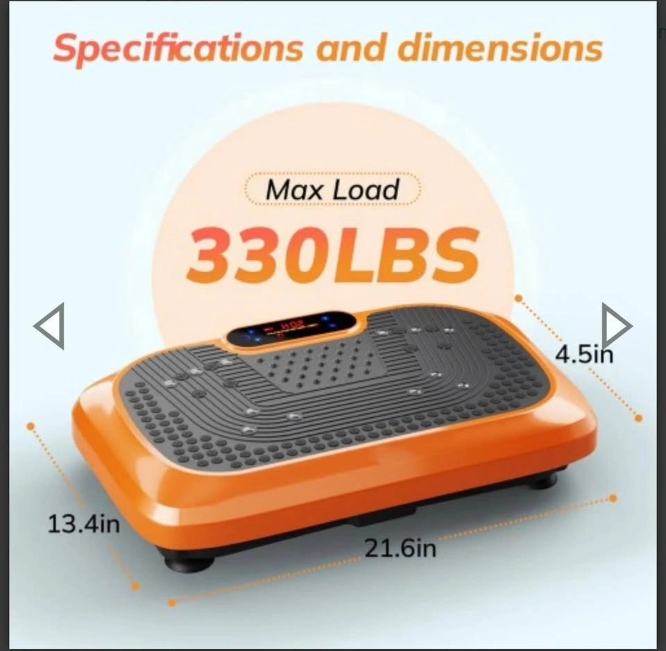 This is brand new in box, received as an annual party gift. It offers full-body vibration training with 20 adjustable speeds and auto programs. The anti-slip surface provides stable support up to 330 lbs. Includes remote and resistance bands. Speed Levels: 1–20. Display: LED Touch Panel. Max Weight Capacity: 330 lbs / 150 kg. Dimensions: 55 cm x 35 cm x 11.4 cm.