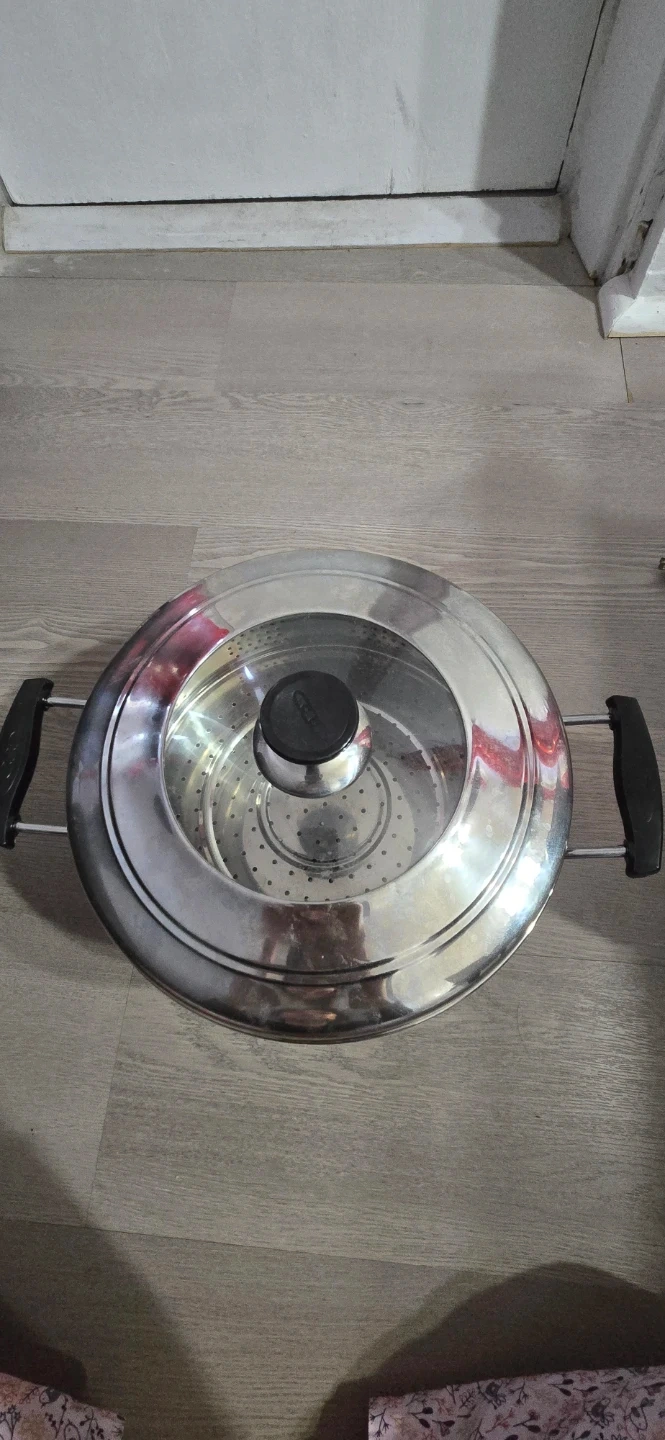 This stainless steel steamer pot includes a perforated insert and a lid. It's made of durable stainless steel with black handles. Pot measures about 11 inches in diameter. Used twice only. Pick up by the buyer.