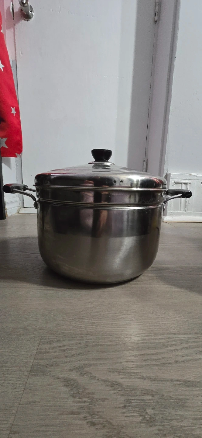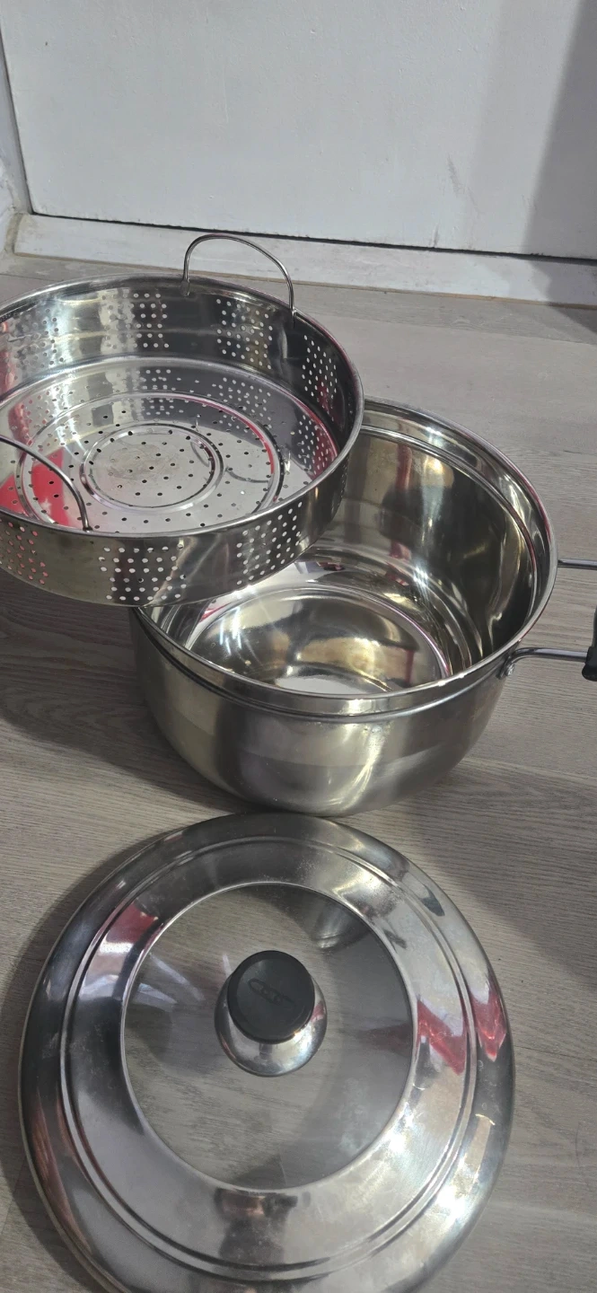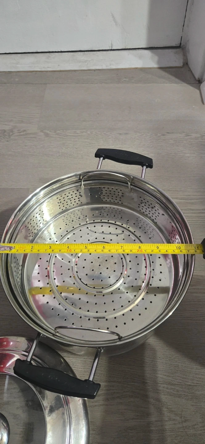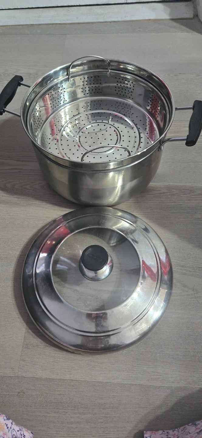 This stainless steel steamer pot includes a perforated insert and a lid. It's made of durable stainless steel with black handles. Pot measures about 11 inches in diameter. Used twice only. Pick up by the buyer.