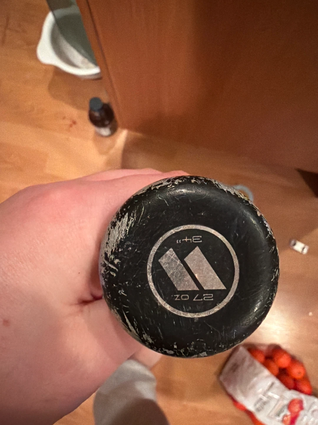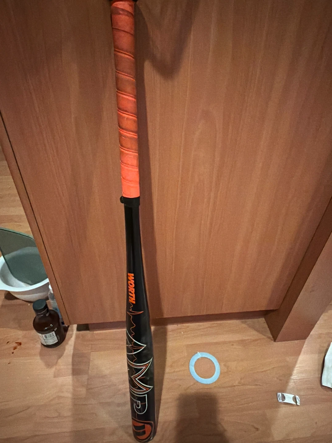 This is a Worth MVP baseball bat. It's 34 inches long and weighs 27 ounces. The grip is orange. Used for 2 seasons but don’t use anymore.