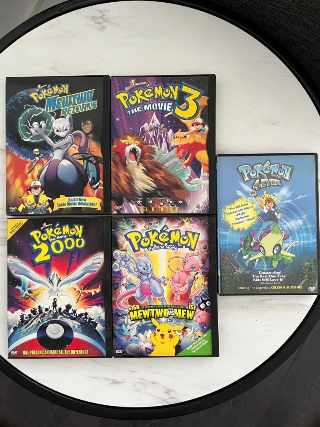 This is a collection of five Pokémon The Movie DVDs. Includes "Mewtwo Returns," "The Movie 3," "4Ever," "2000," and "The First Movie: Mewtwo Strikes Back." Great for any Pokémon fan!