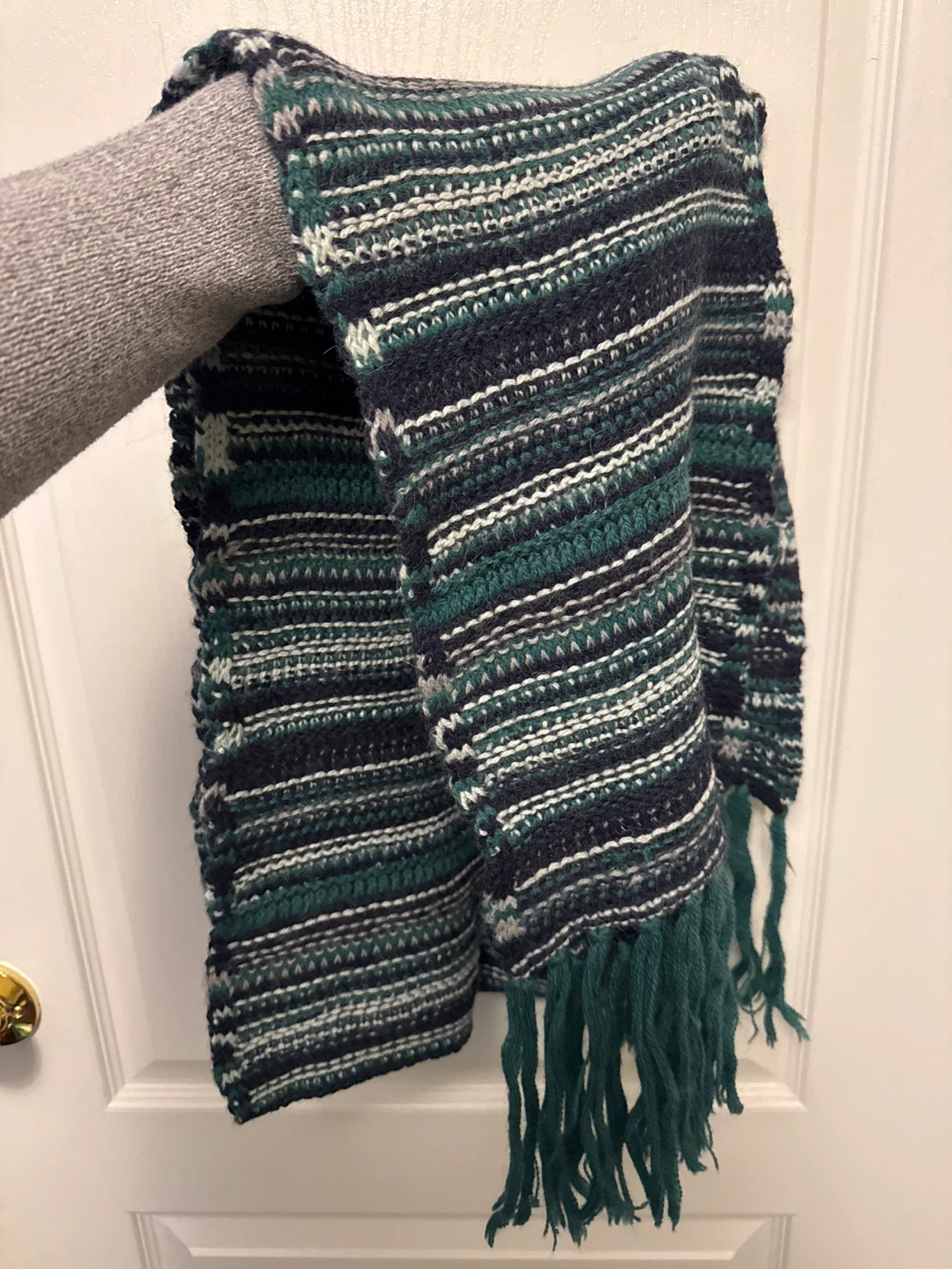 Brand new cozy scarf made from an alpaca, acrylic and wool blend. It features a striped pattern with fringe details. Great way to stay warm or a nice gift, still has part of the tag on it.