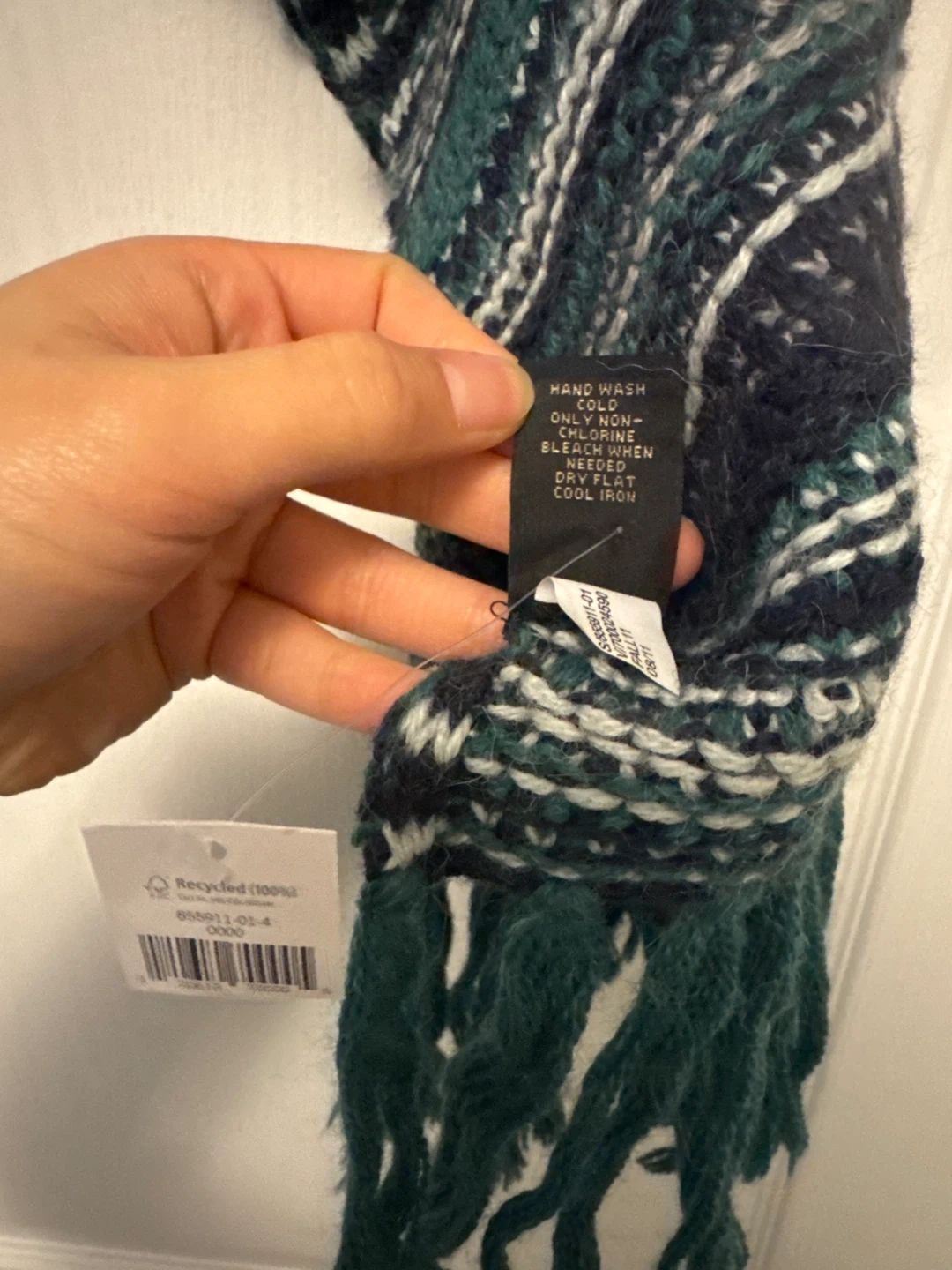 Brand new cozy scarf made from an alpaca, acrylic and wool blend. It features a striped pattern with fringe details. Great way to stay warm or a nice gift, still has part of the tag on it.