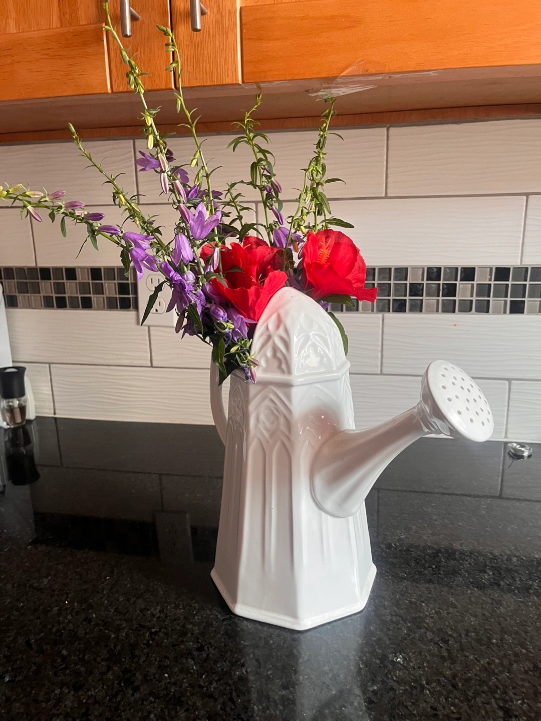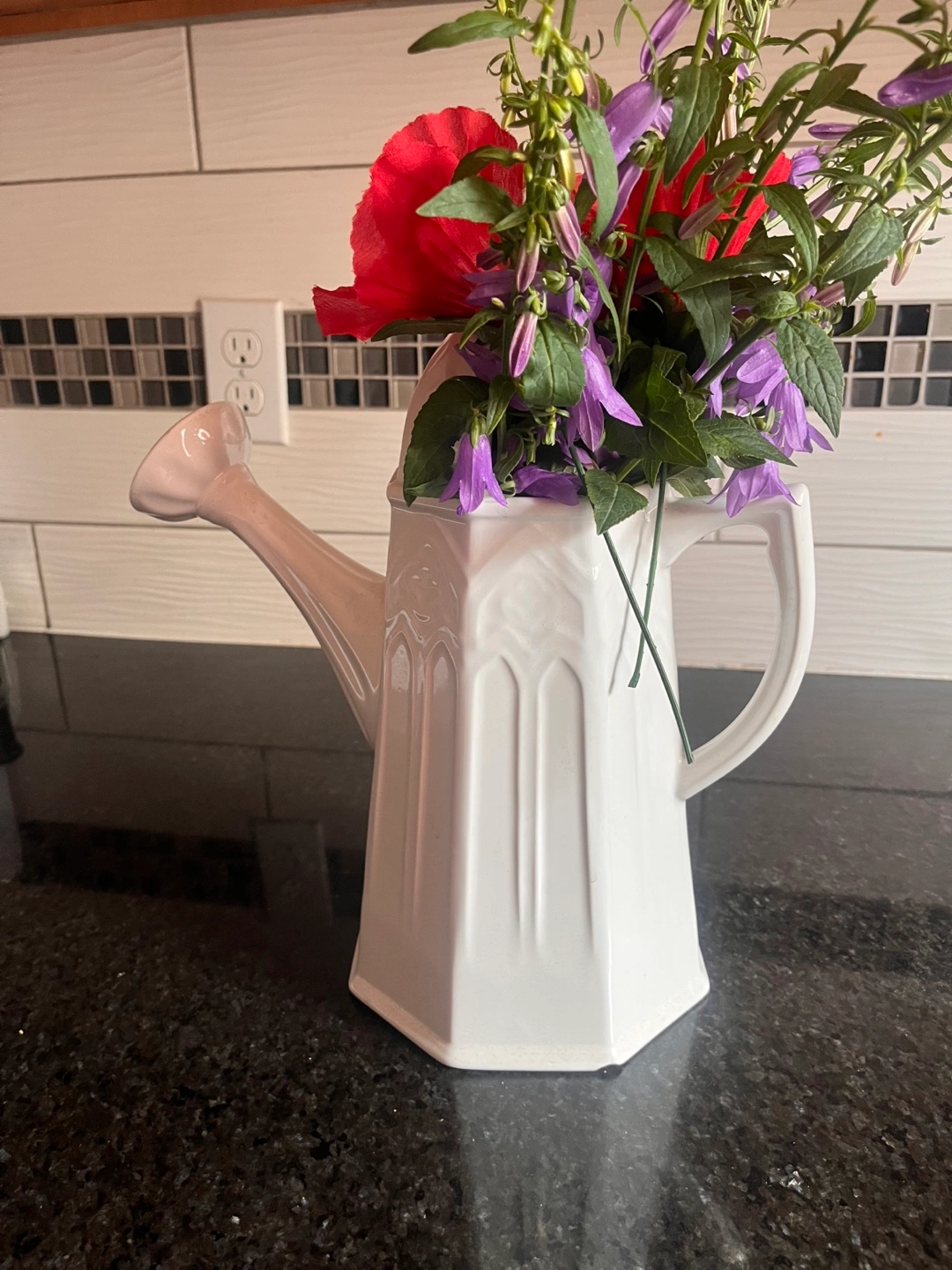 White ceramic watering can vase! It's a charming piece that adds a touch of whimsy to any room. Perfect for displaying flowers or as a standalone decorative item.