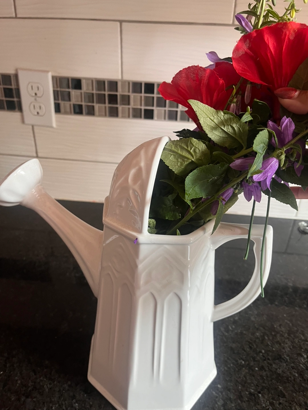 White ceramic watering can vase! It's a charming piece that adds a touch of whimsy to any room. Perfect for displaying flowers or as a standalone decorative item.