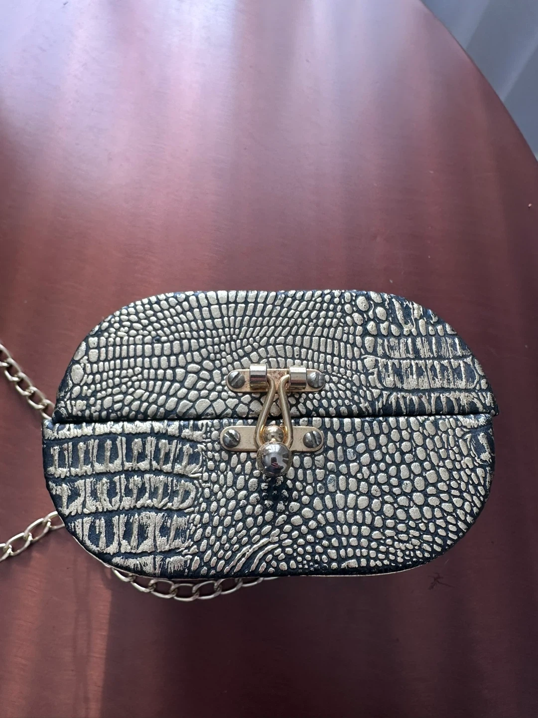 This unique oval-shaped evening bag has a textured gold crocodile pattern. It's complete with a secure clasp closure and a detachable gold chain strap. Perfect for adding a touch of glam to any outfit!