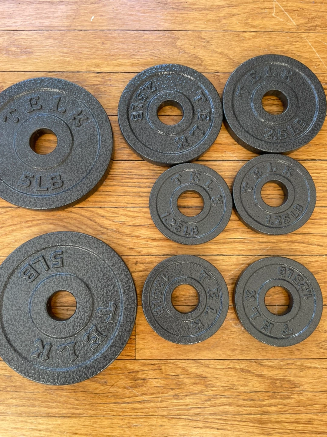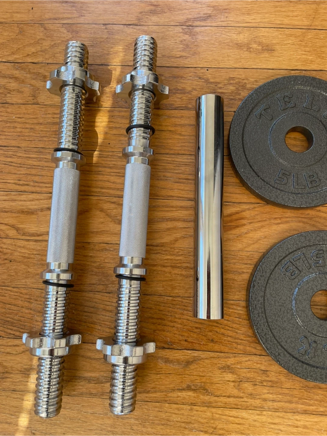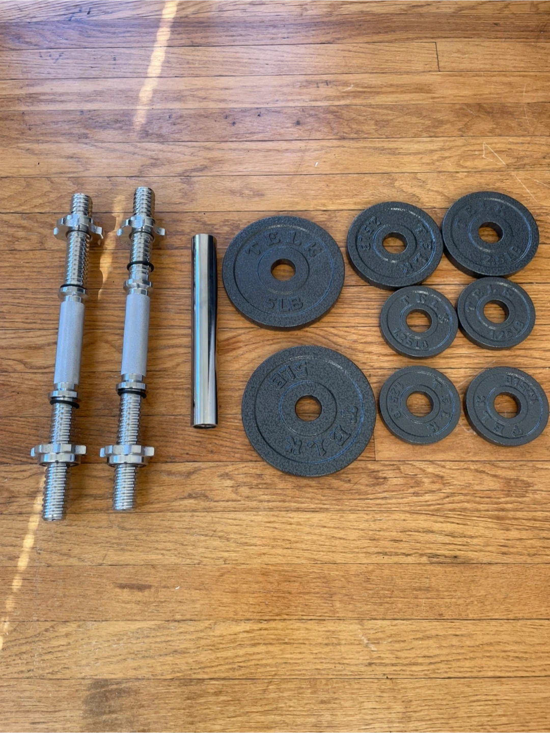 This set includes two dumbbell bars and a connecting bar for versatile workouts. It comes with four 5lb weight plates, four 2.5lb plates, and four 1.25lb plates. Build your own weight combinations for strength training!