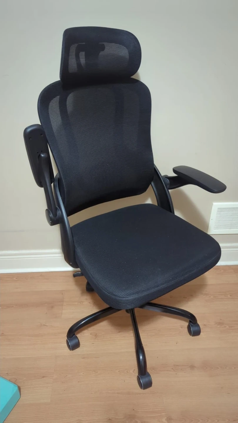 This black mesh office chair features a supportive headrest and adjustable armrests. Its ergonomic design includes a comfortable seat and a sturdy base with wheels for easy mobility. It's built for long-term use during work or study.
