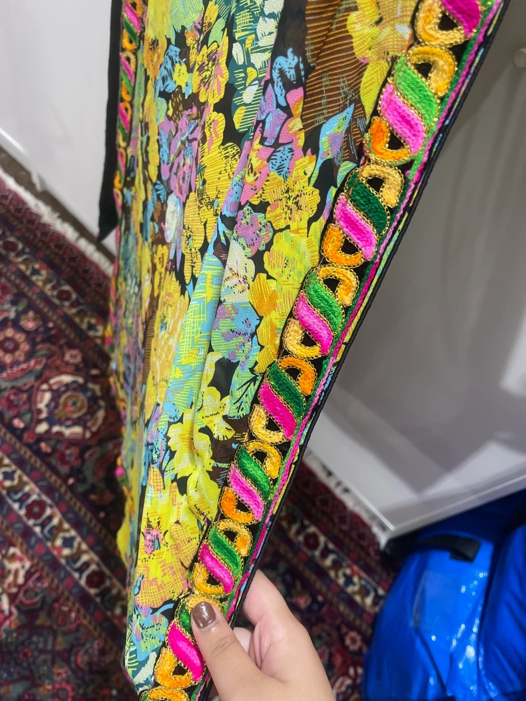 This is a beautiful long sleeve dress with a vibrant floral print. It features a unique and colourful embroidered trim. Perfect for adding a pop of colour to your wardrobe!