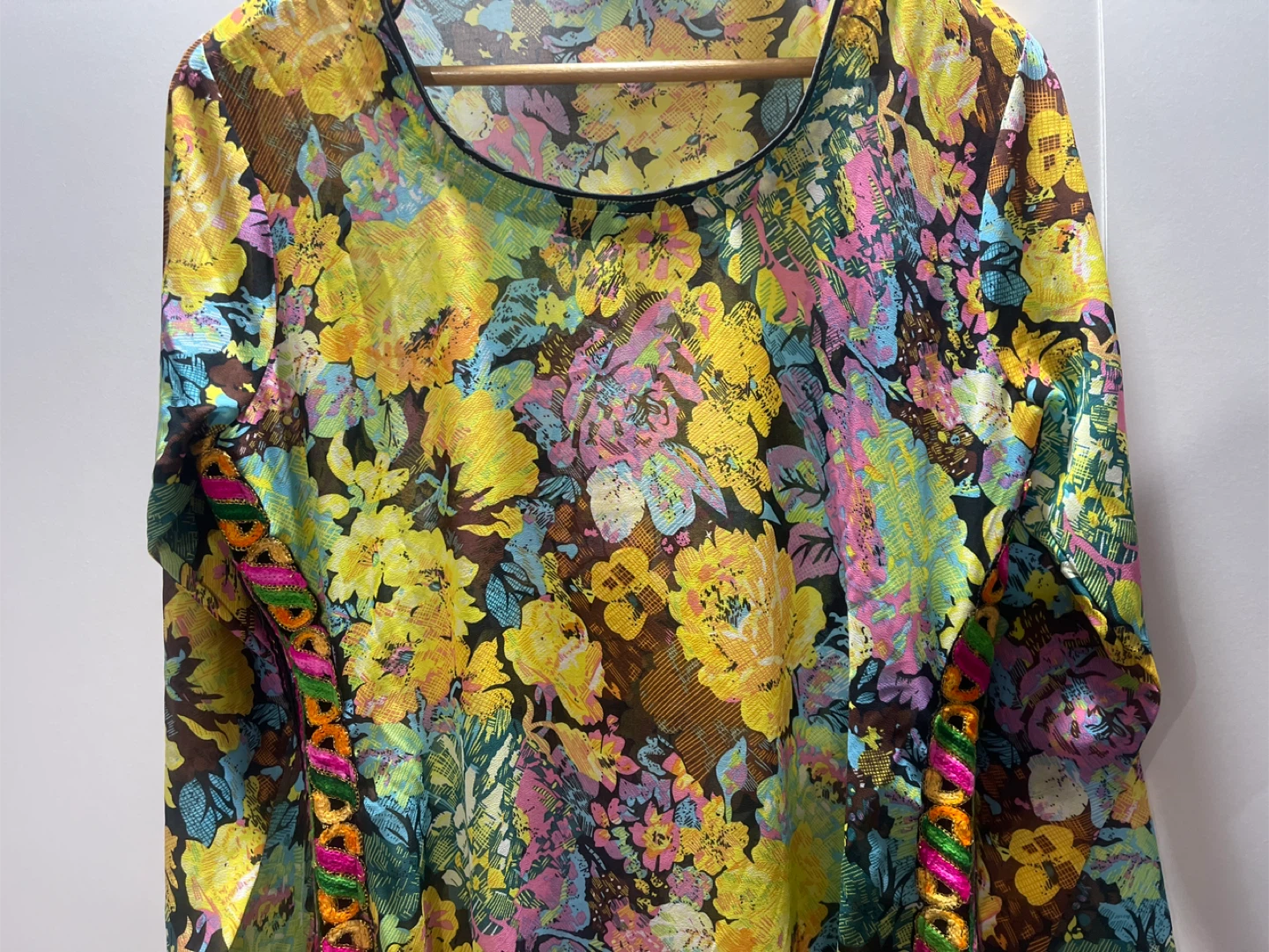 This is a beautiful long sleeve dress with a vibrant floral print. It features a unique and colourful embroidered trim. Perfect for adding a pop of colour to your wardrobe!