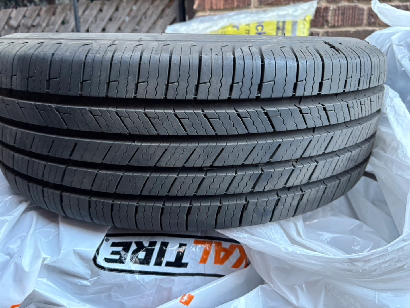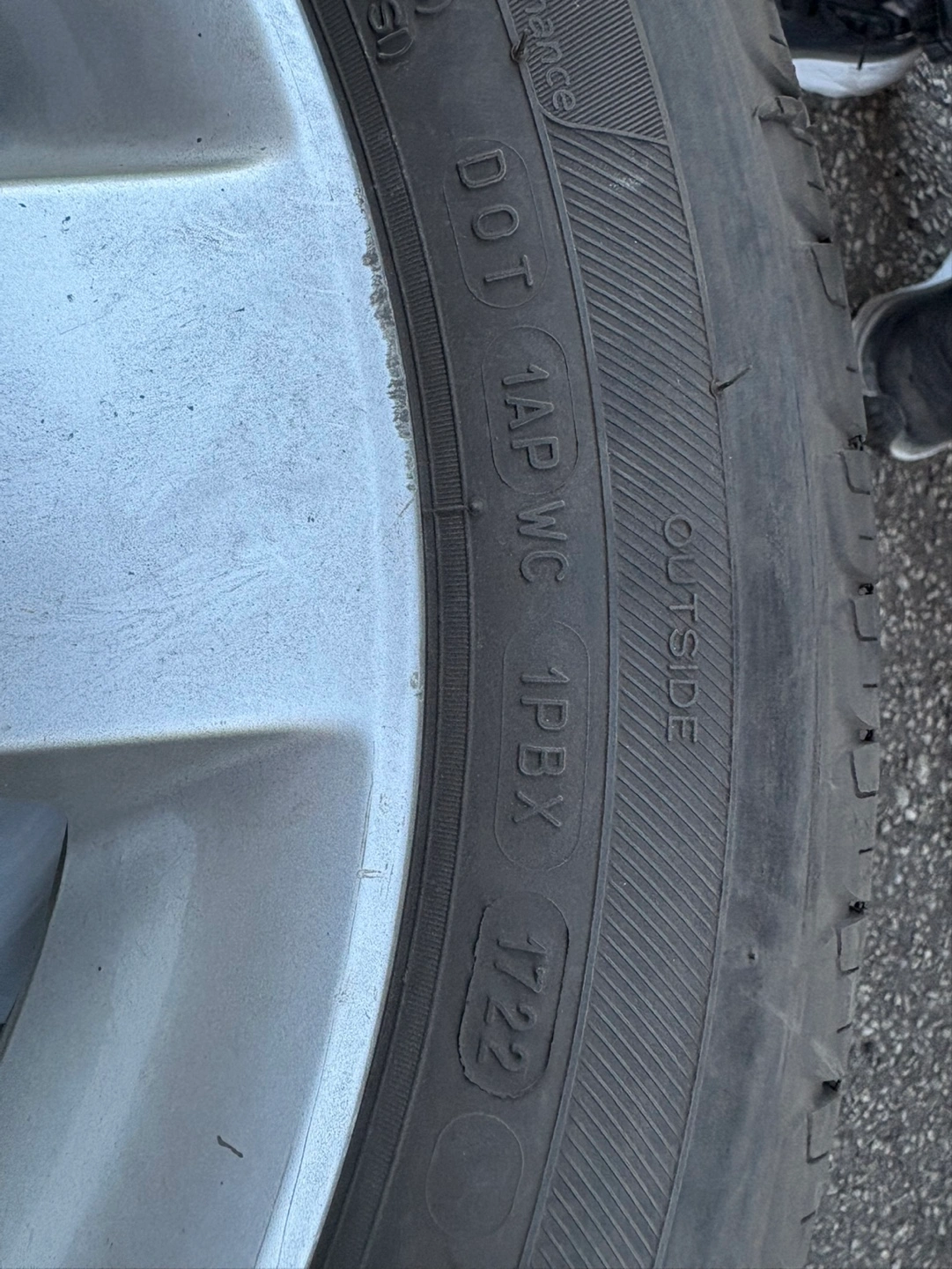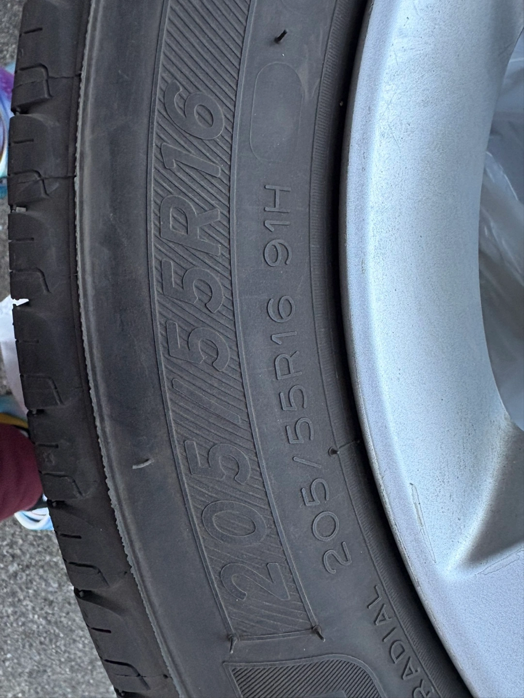 All season tired on silver rims used for “2 summer seasons” by an elderly lady who doesn’t drive much. A few marks on the rims tires are barely used