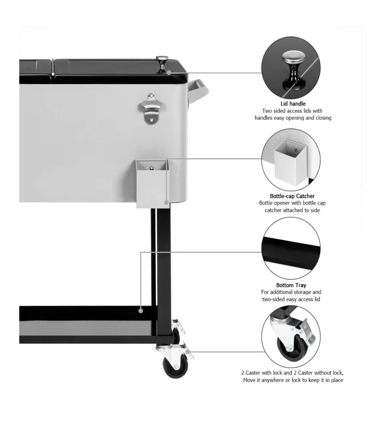It also has a lid handle, bottle cap catcher, and bottom tray for additional storage. The detachable pipe makes it easy to drain. Move it anywhere or lock it to keep it in place with the 2 casters with lock and 2 casters without lock