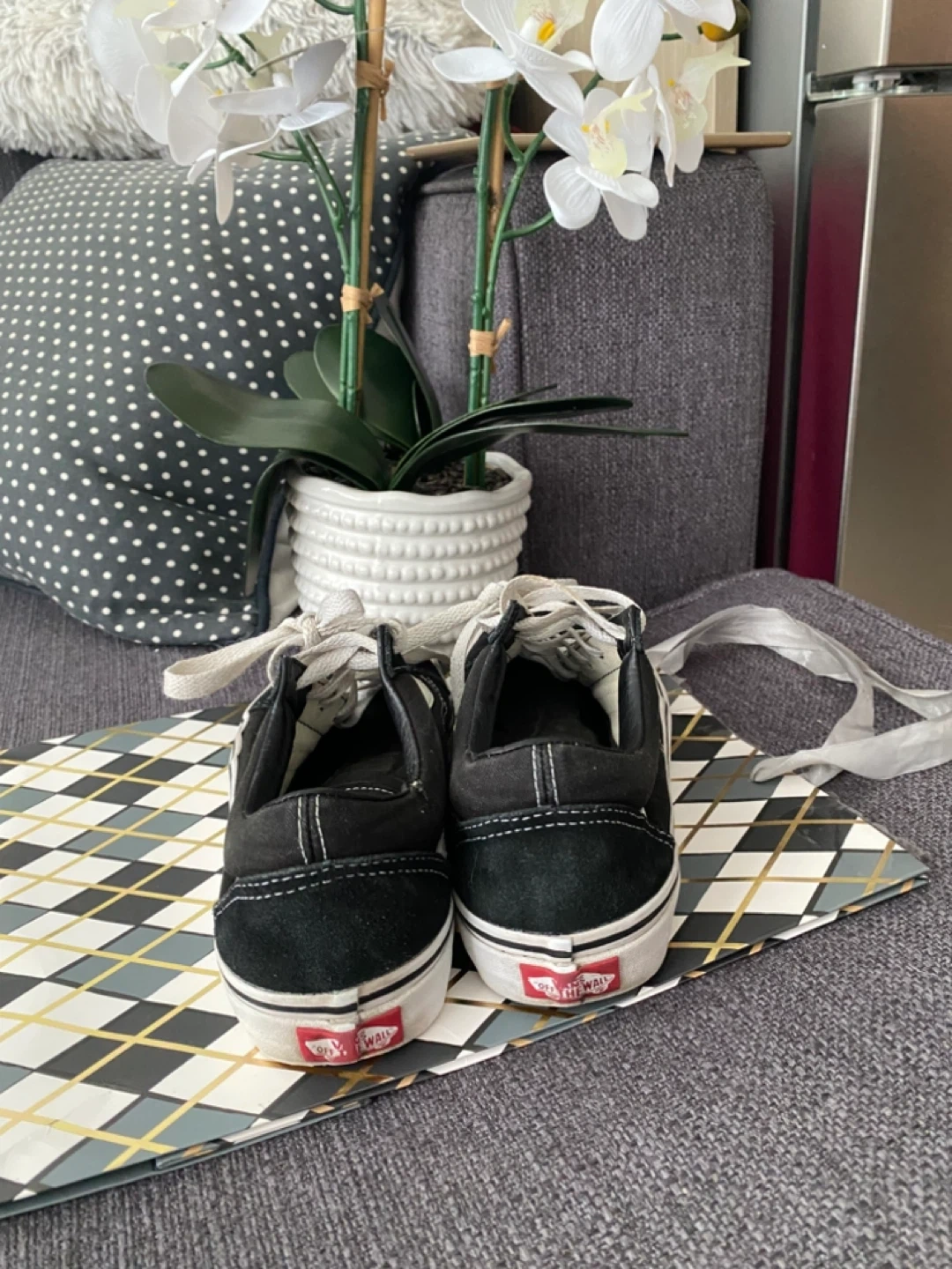 Classic Vans Old Skool sneakers in black with white stripe detail. Suede and canvas upper. These are a US Women's size 7.5 (EUR 38.0, UK 5.0). Some minor signs of wear, as shown in photos.