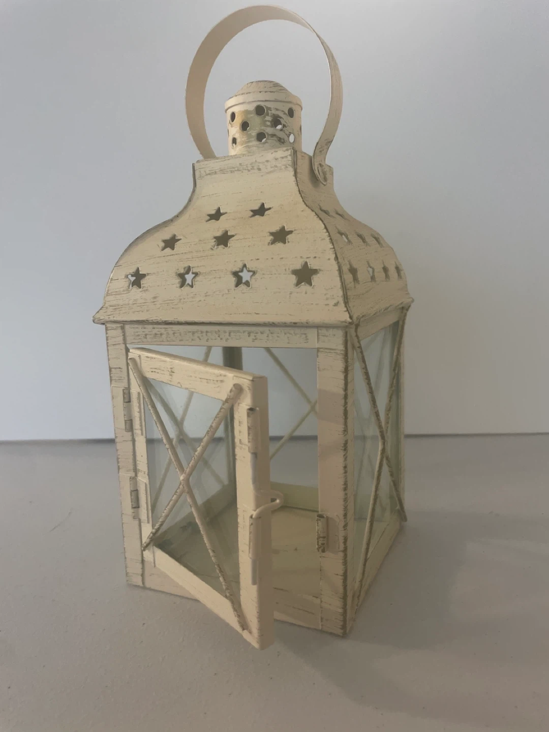 Cream metal lantern featuring decorative star cutouts and glass panels. It has a hinged door for easy access. This lantern adds a cozy touch to any space.