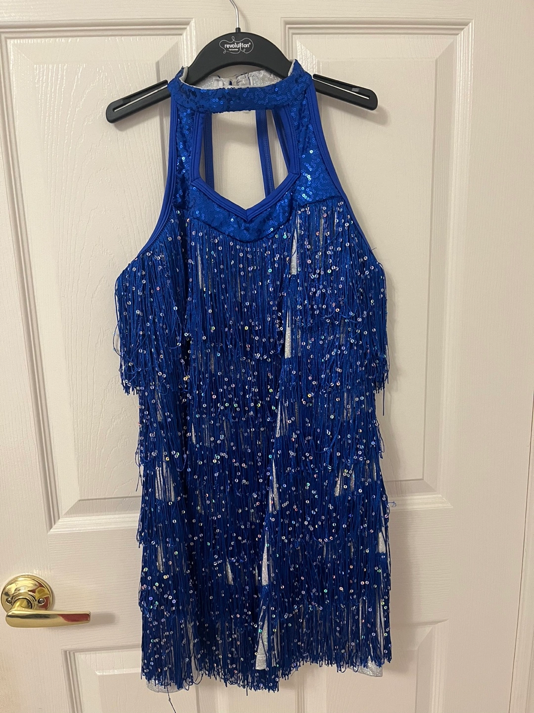 Blue sequined dance dress with fringe. Halter style with cut-outs in the back. Worn once for a performance.