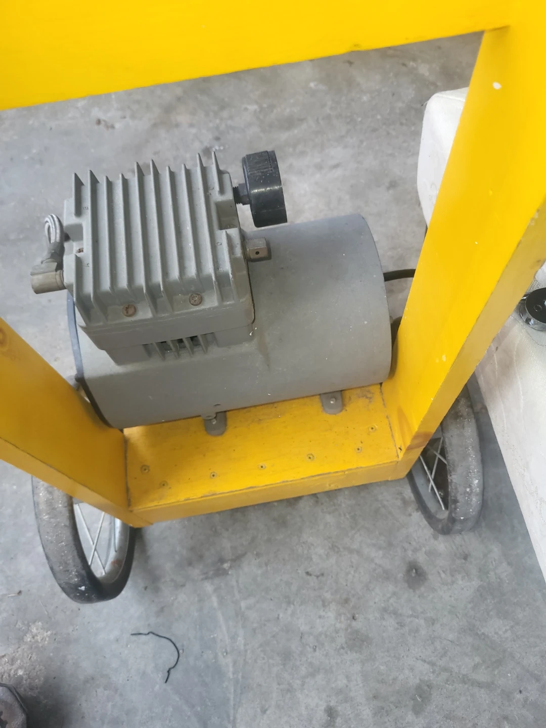 Thomas Power Air Division air pump. Model 1107CK75-1135. 10.5A, 1150 RPM, 60HZ. Thermally protected motor. Includes original hoses and wheels for mobility.