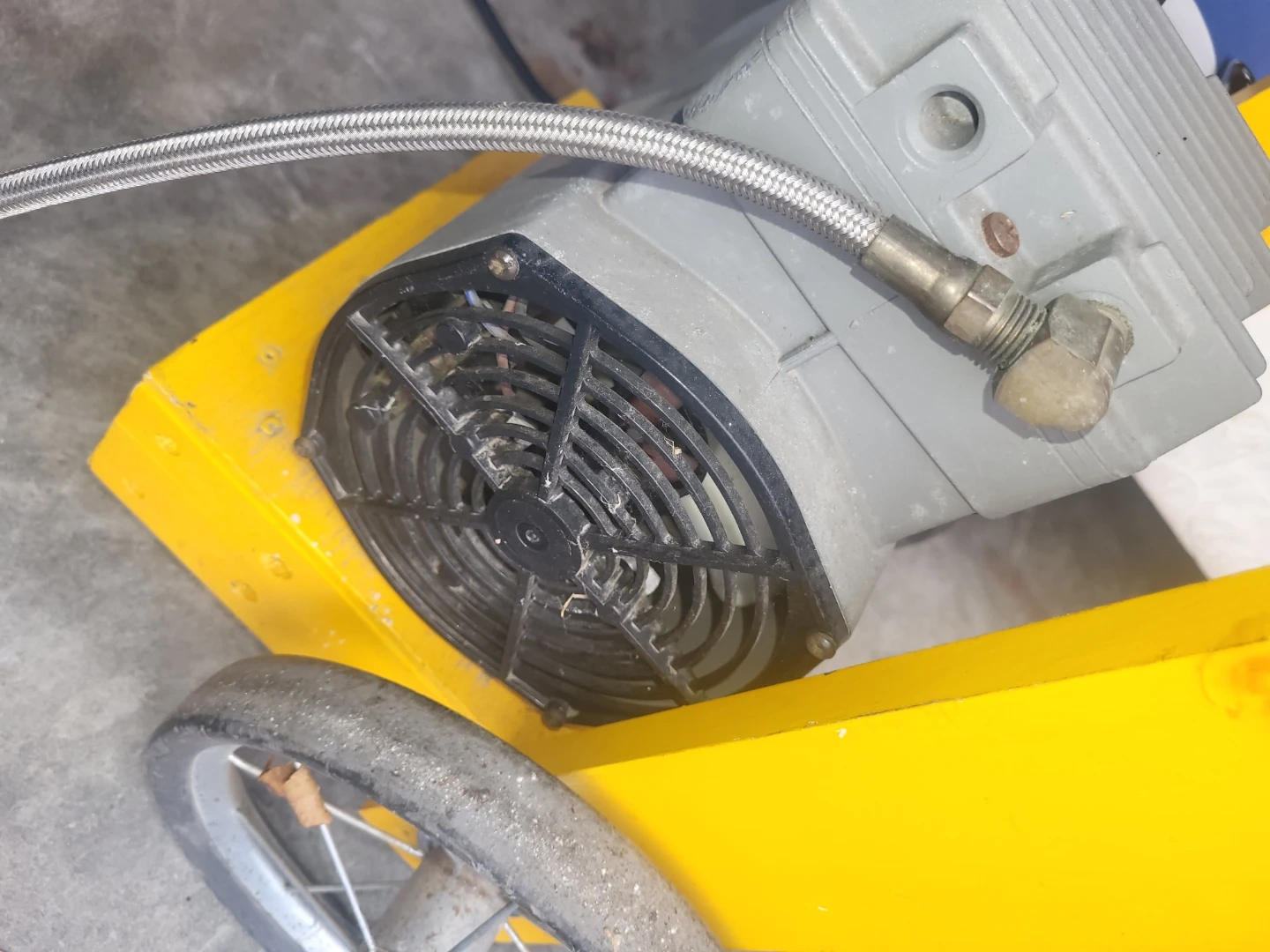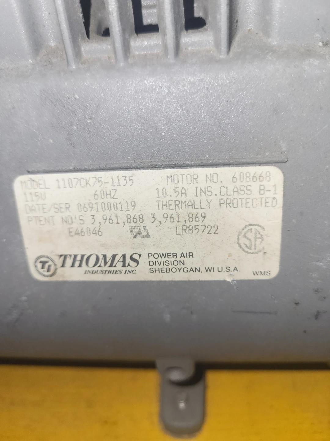 Thomas Power Air Division air pump. Model 1107CK75-1135. 10.5A, 1150 RPM, 60HZ. Thermally protected motor. Includes original hoses and wheels for mobility.