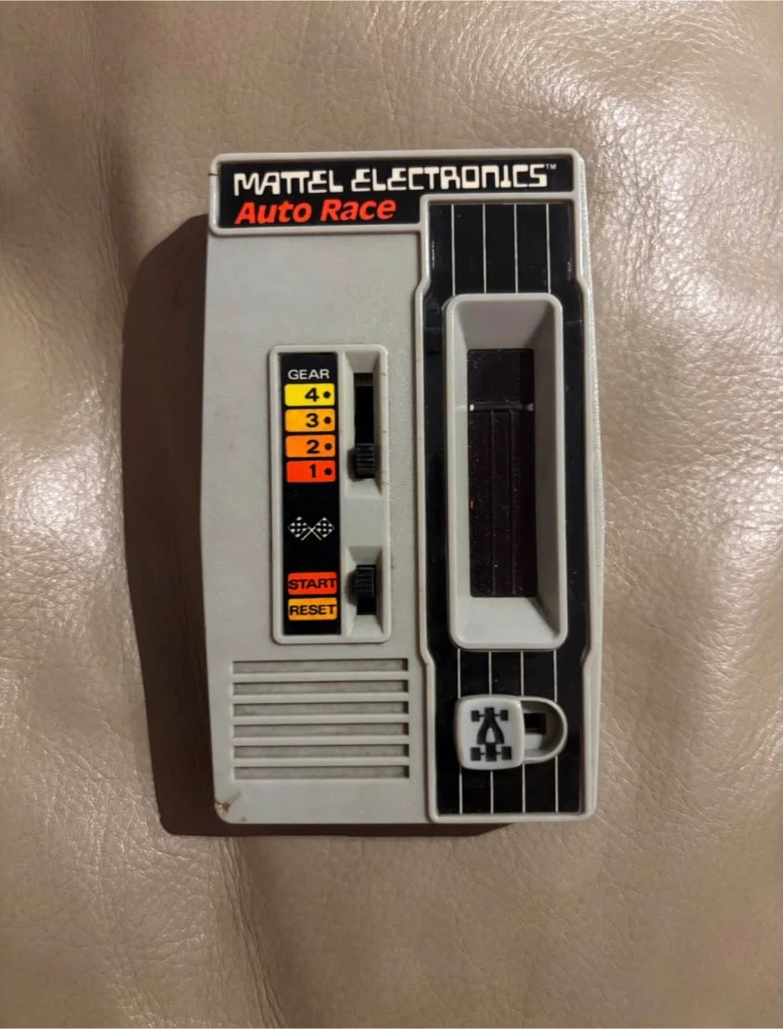 This is a Mattel Electronics Auto Race handheld electronic game. It features adjustable gear settings and a start/reset button. This game is a fun retro electronic toy!