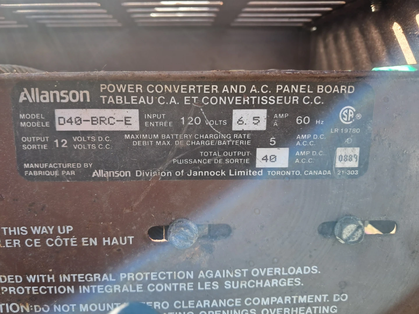 This Allanson D40-BRC-E unit is a power converter and A.C. panel board. It has a 120 volt input and a total output of 40 amps. Manufactured by Allanson Division of Jannock Limited.