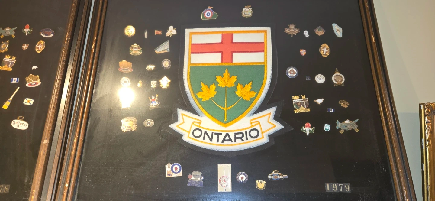 Framed display featuring the Ontario crest and numerous collectible pins. Pins depict various Canadian themes, symbols, and events. Display dated 1978 and 1979 on bottom right.