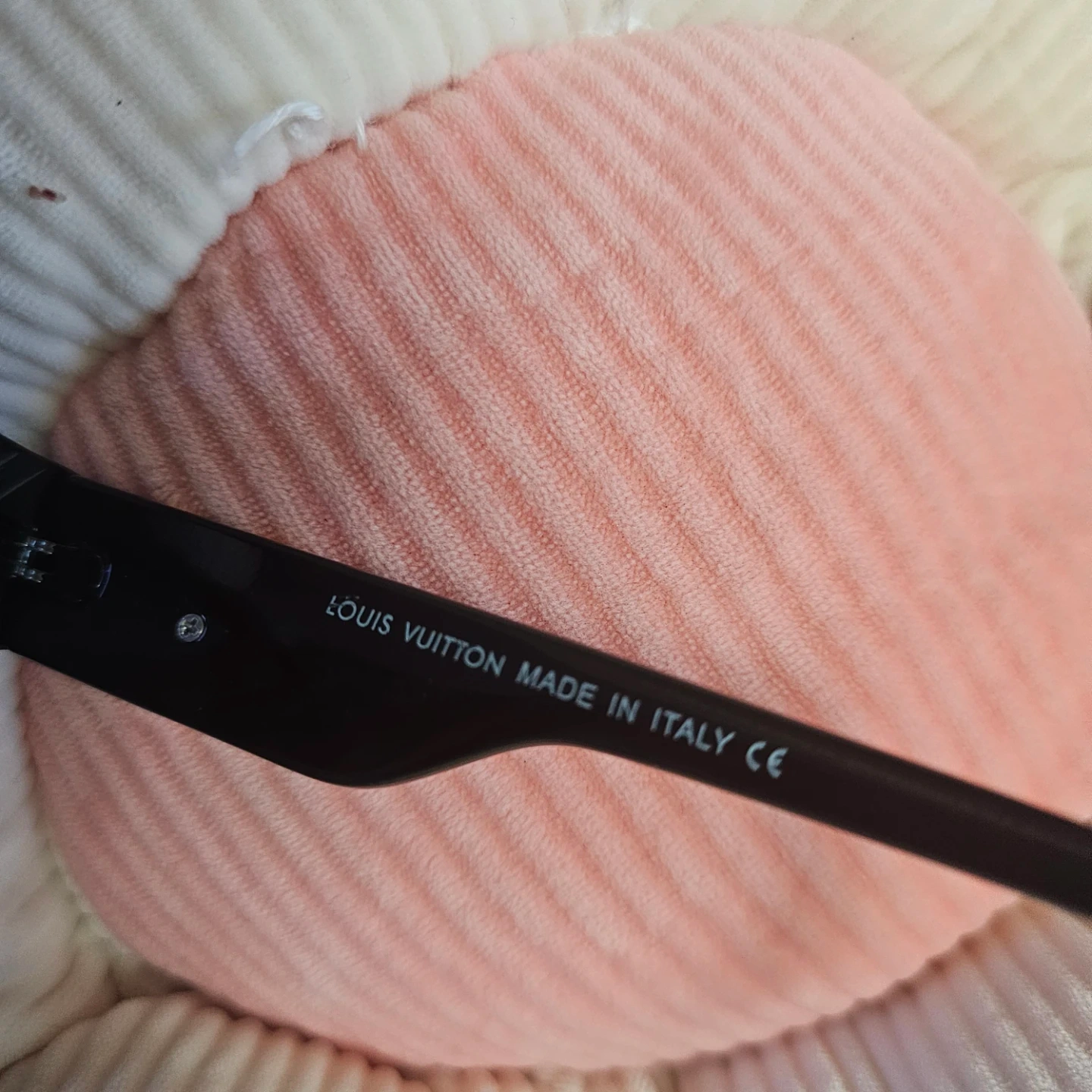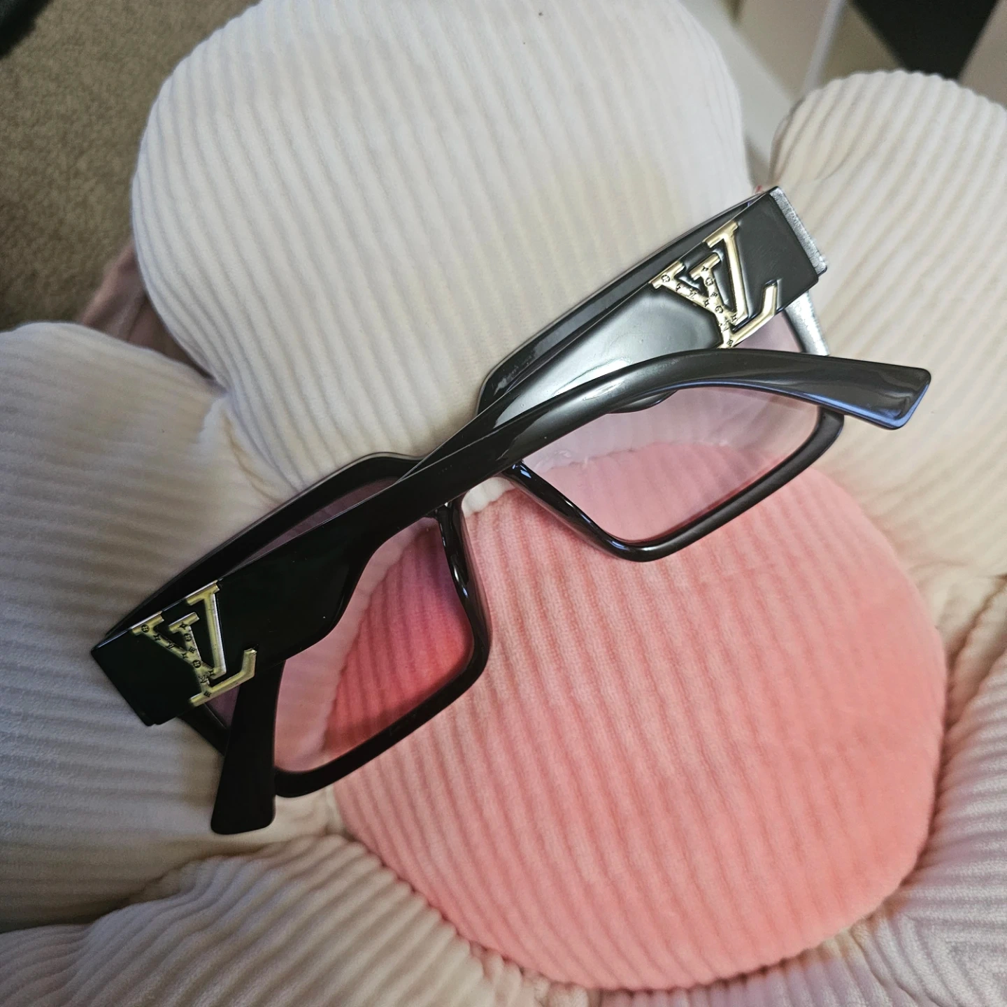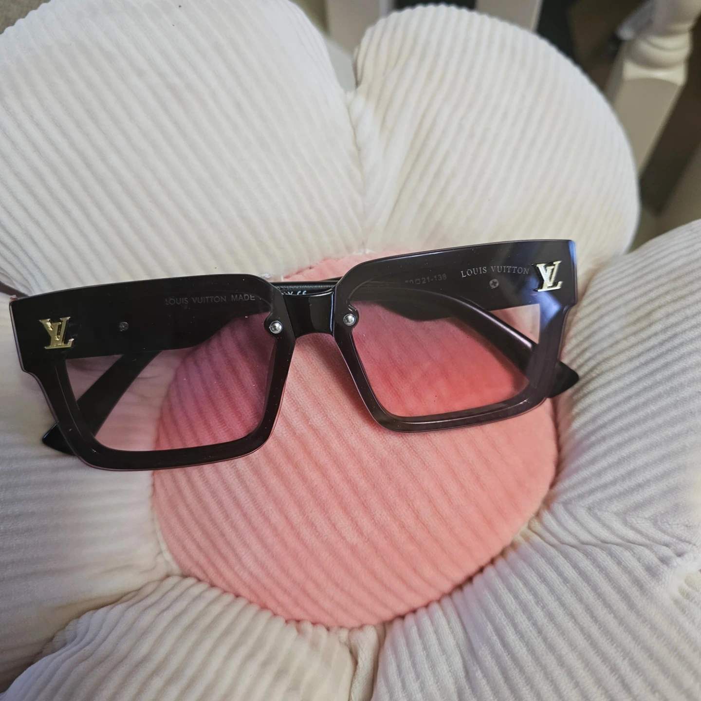 Stylish black Louis Vuitton sunglasses with a pink tint to the lenses. Made in Italy. These shades are a great accessory for sunny days!