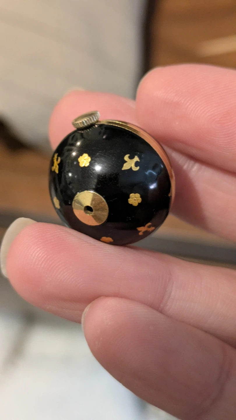 This vintage Heno pendent wind-up watch features black and gold enameling. It is still ticking but it is otherwise untested and sold as-is. There is a scratch on the surface of the watch face, shown in the images. The pendant does not come with a chain.