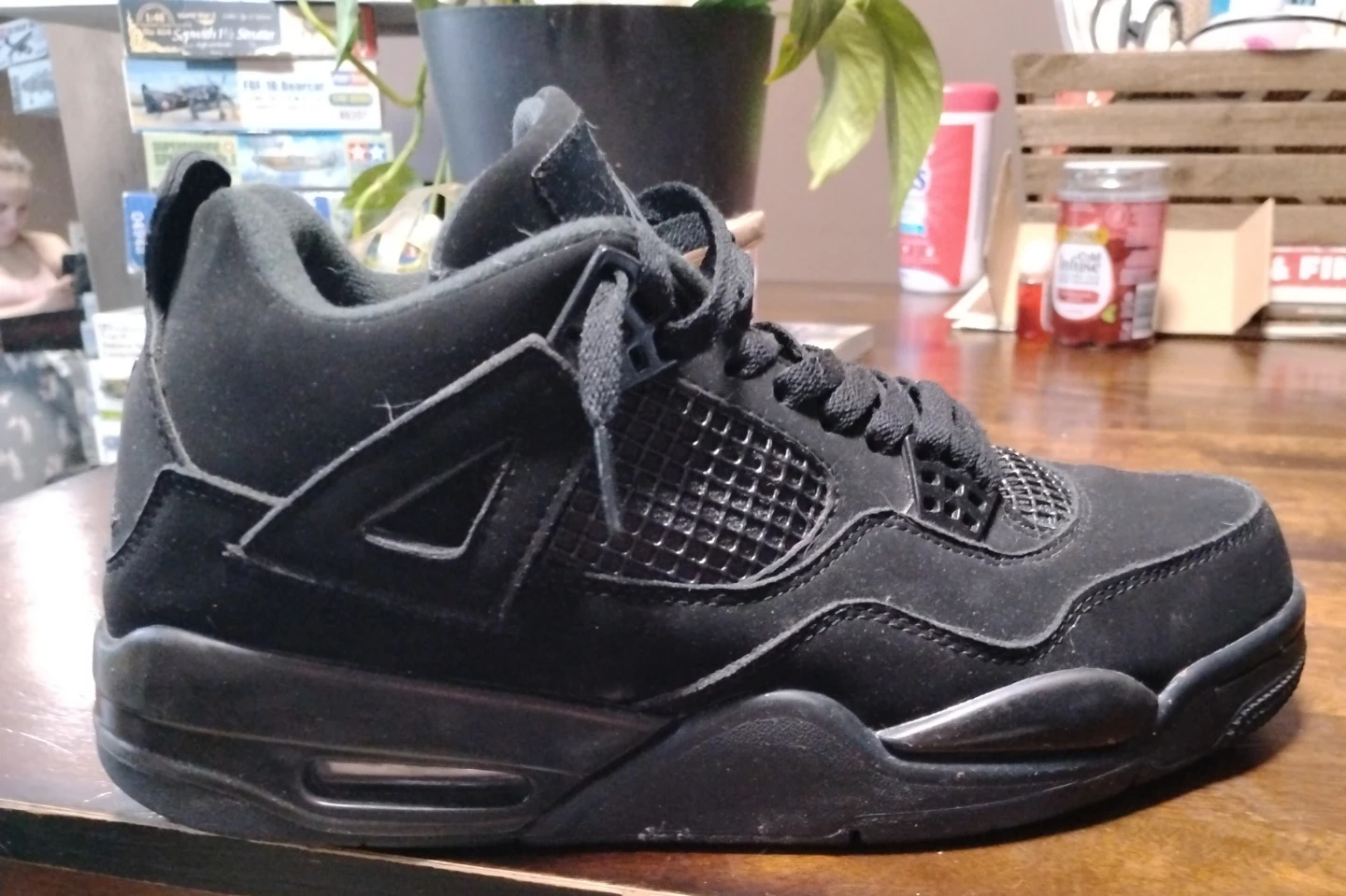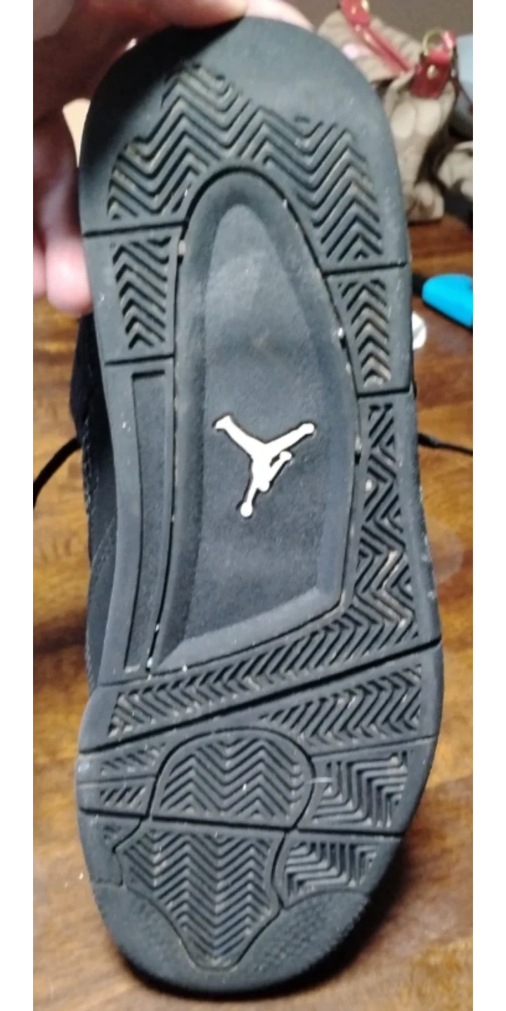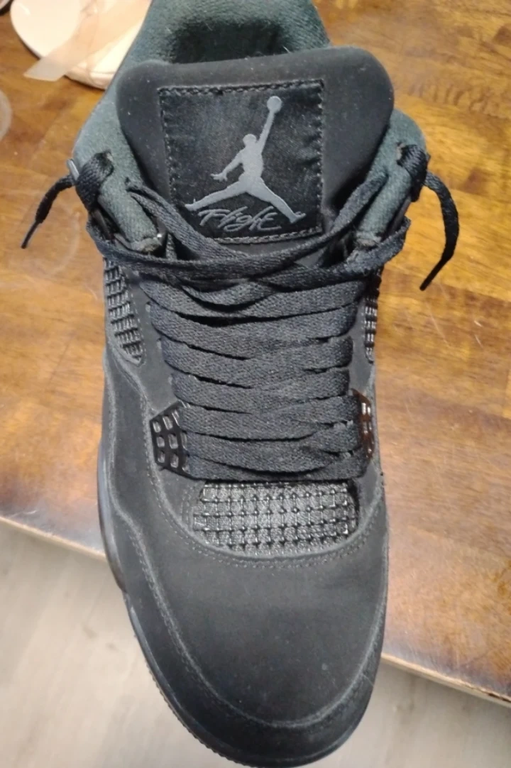 Air Jordan 4 "Black Cat" in all black. Suede material with mesh accents. Men's size 10 no insoles. Honestly I don't know whether they are authentic or if they are not so it's either my lost or gain or making your loss I'm not too sure if you can tell the difference and want to purchase them for the above price you can come and take a look at them that's not a problem