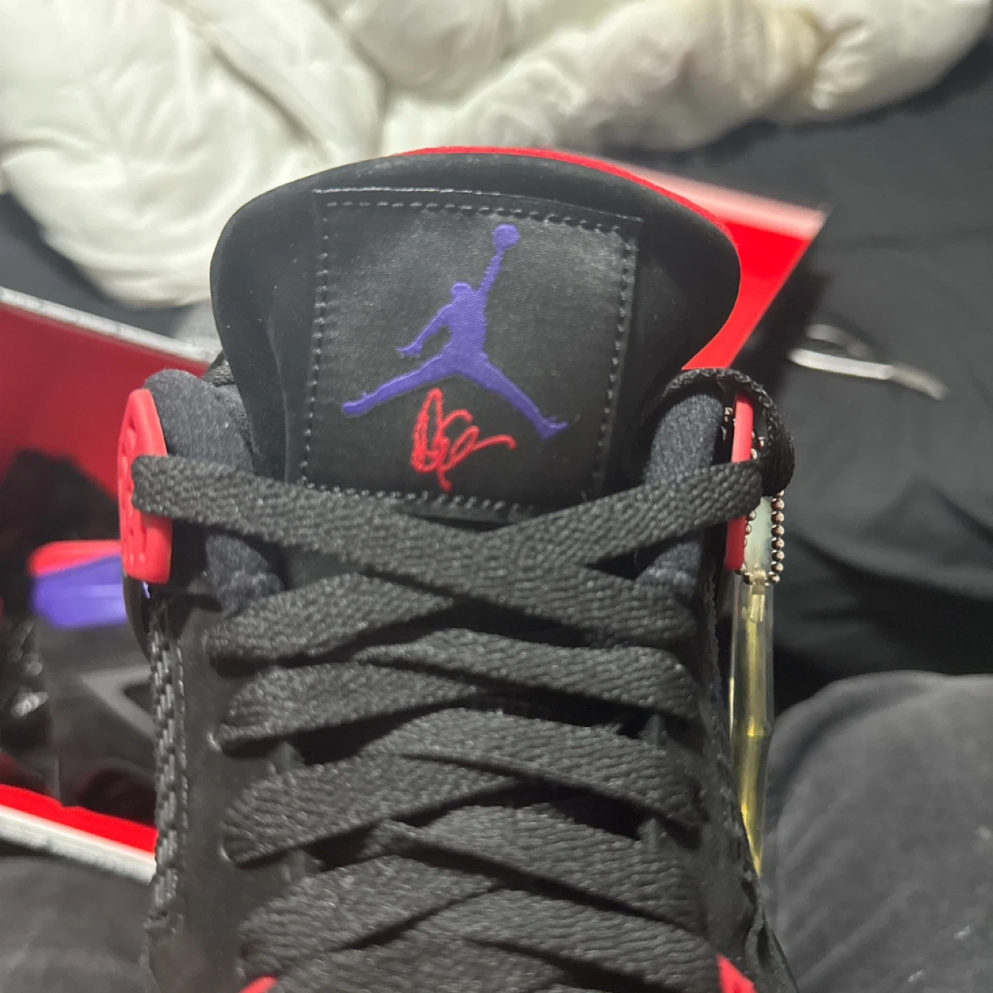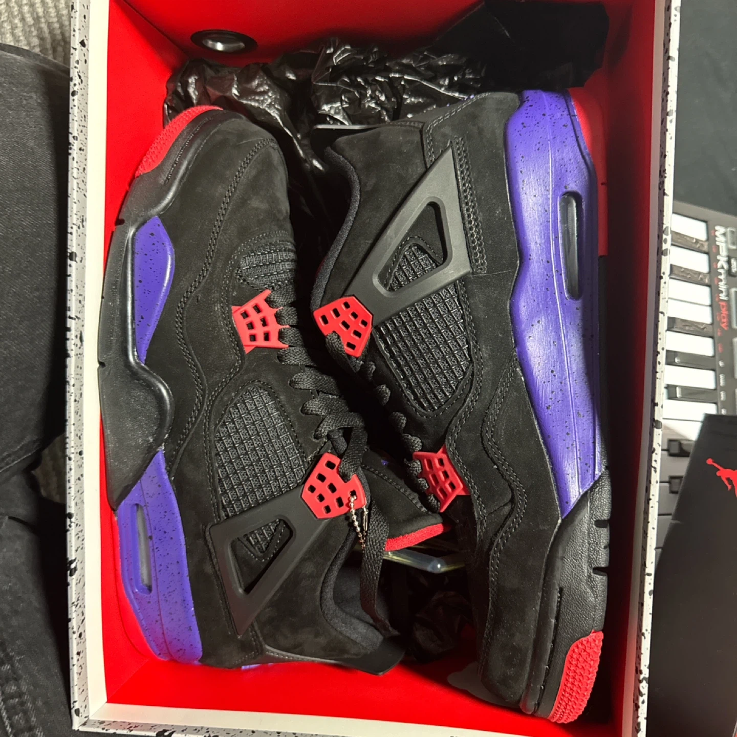 These are the Air Jordan 4 Retro NRG in the "Court Purple" colourway. Black suede uppers with vibrant purple accents on the midsole and heel tab. Includes original box.